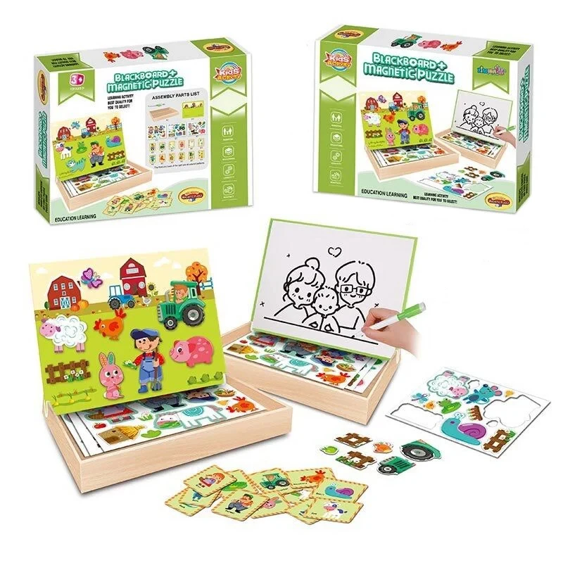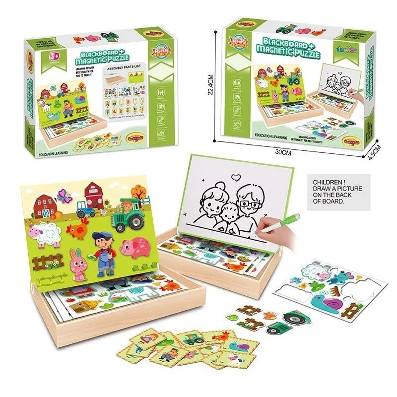 Представляємо захопливу та багатофункціональну гру для розвитку дитини віком від трьох років. Даний набір — це ідеальне поєднання магнітних пазлів та зручної для малюків дошки для малювання. Всі елементи акуратно зберігаються в міцному коробі-органайзері, що гарантує зручність та порядок після гри. Одна сторона кришки служить магнітною дошкою для збирання тематичних картинок. Друга сторона — це дошка «пиши-витирай», для якої в комплекті є спеціальний маркер. Використовуючи магнітні елементи з зображеннями тварин, сільськогосподарської техніки та працівників ферми, дитина може створювати власні ігрові сюжети.