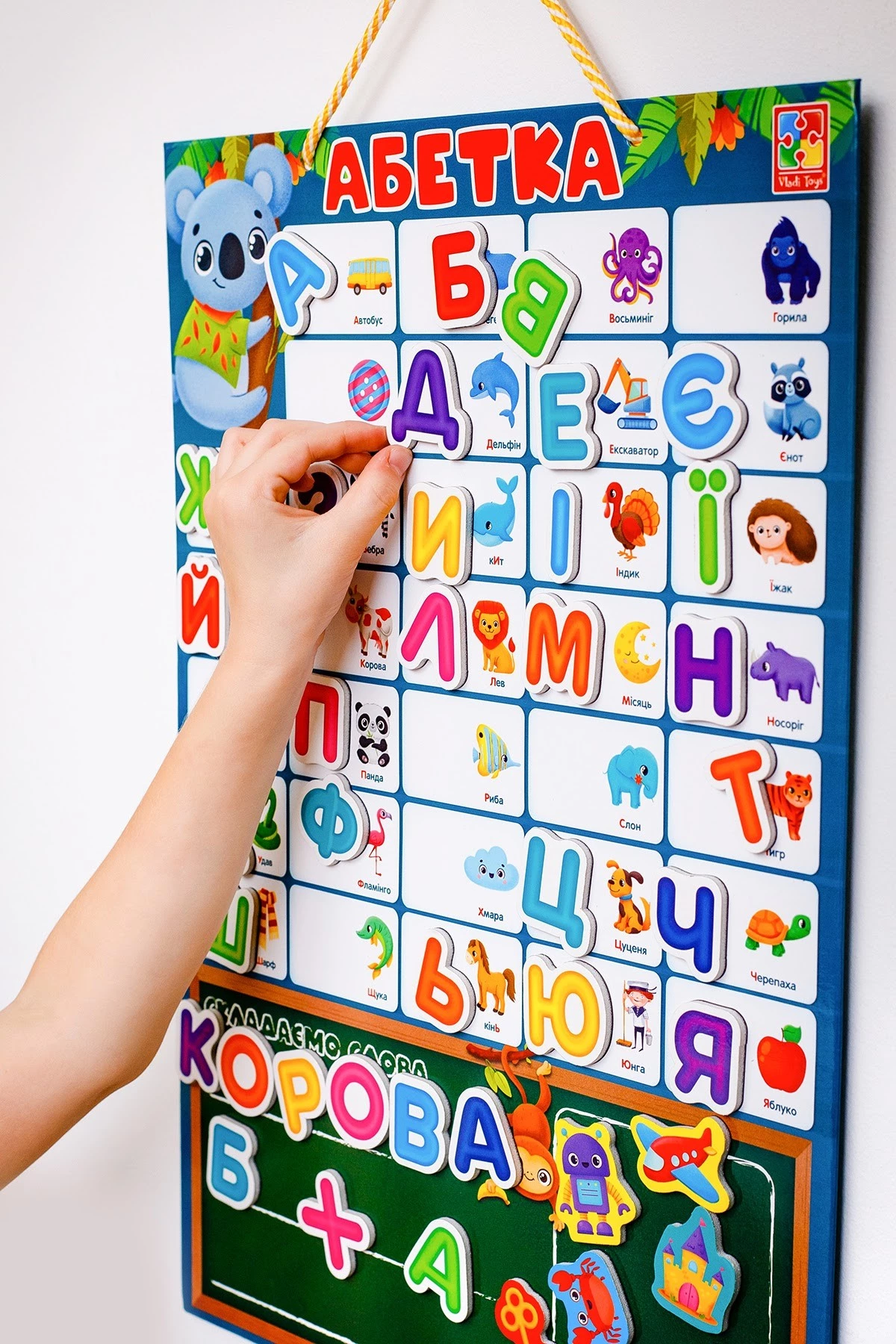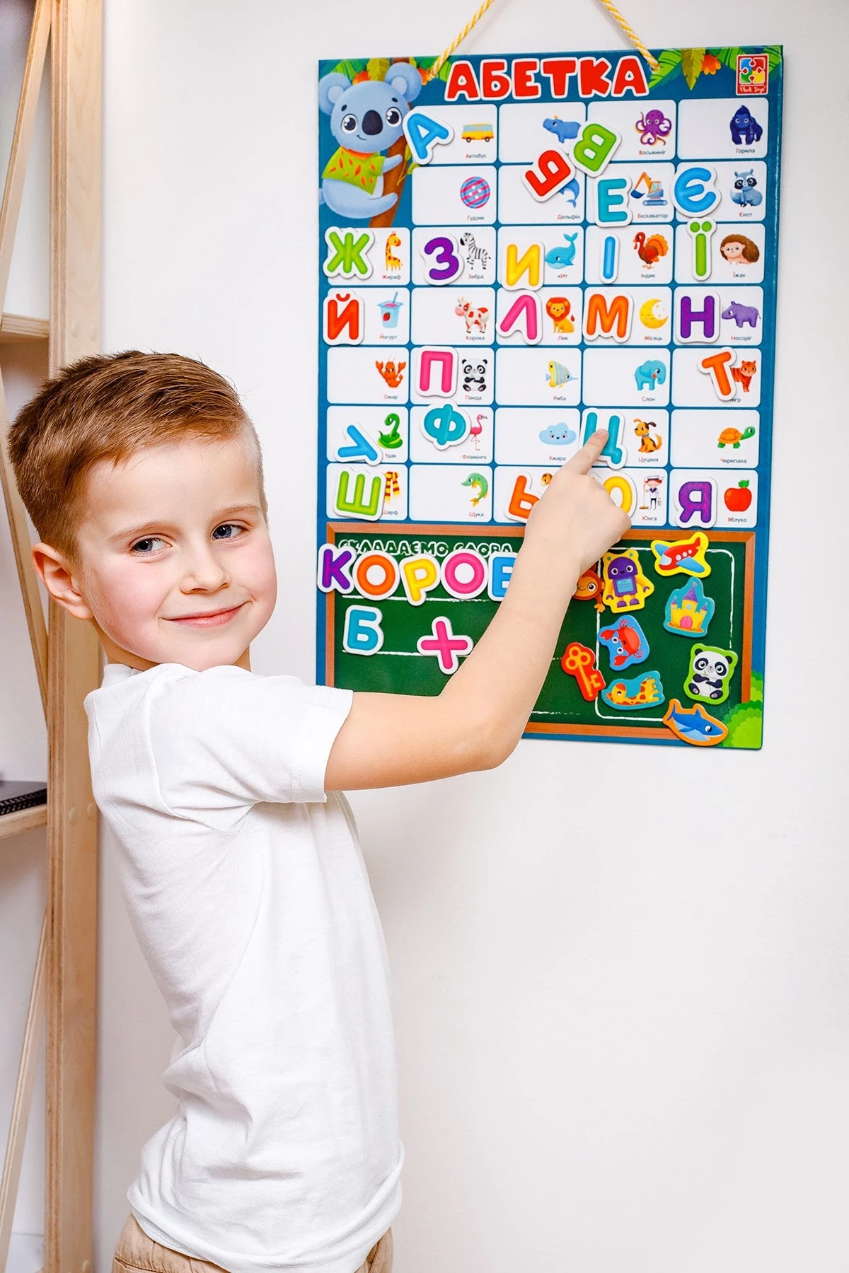 Вивчайте алфавіт за допомогою веселих магнітів! Повісьте ігрове поле на стінку (для цього є спеціальна ручка) та починайте гру. Познайомте малюка з назвами букв. Після цього розгляньте прямокутні магніти з зображеннями літер, а також слів, що починаються на ту чи іншу літеру. Прочитайте разом усі слова.