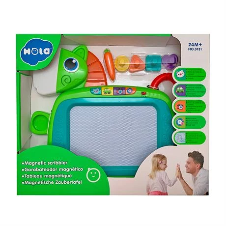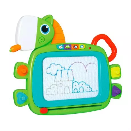 Яскрава магнітна дошка для малювання в формі веселого поні відразу приверне увагу дитини. На ній навіть є кнопки зі звуковими ефектами (але без слів). Носити її можна за зручну ручку, а паличкою-морквиною після малювання можна "погодувати" поні. У наборі так само йдуть фігурні кольорові штампи для доповнення картинок.