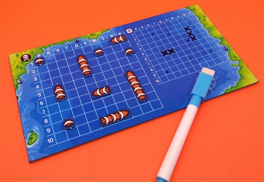 Знаменита гра морський бій в дуже зручному компактному варіанті, прекрасно підійде для дитини, який любить логічні ігри. Завдяки магнітній основі, її можна брати з собою в поїздки, адже маленькі кораблики надійно кріпляться до ігрового поля. Відзначати свої постріли необхідно на спеціальному полі, що стирається маркером. Переможе той, хто першим зіб'є всі кораблі супротивника. У таку гру дуже цікаво грати з друзями та батьками.