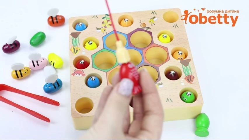 Яскрава і цікава гра з бджолами на дереві і елементами риболовлі дуже добре підходить дітям від трьох років. Іграшка виконує безліч функцій. Всі деталі зроблені з дуже якісної деревини. За допомогою цієї гри можна легко пояснити дітям, як на фруктах з'являються черв'яки і де живуть бджоли. Граючи, дитина розвиває дрібну моторику, тренує хватку великими і вказівними пальцями, запам'ятовує нові послідовності дій.