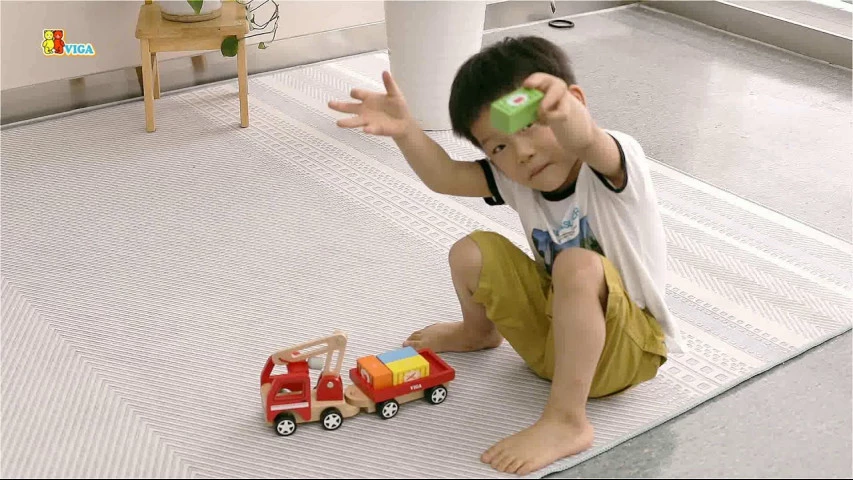Барвиста дерев'яна машинка автокран зі знімним причепом для перевезення контейнерів і складаною стрілою з магнітом. У наборі так само йдуть чотири кольорових контейнера. Їх можна завантажувати на причеп і вивантажувати з нього за допомогою магніту на стрілі автокрана. Стріла крана обертається на 360 градусів. Дитина може придумувати різні ігри з машинкою, розвиваючи фантазію і дрібну моторику.