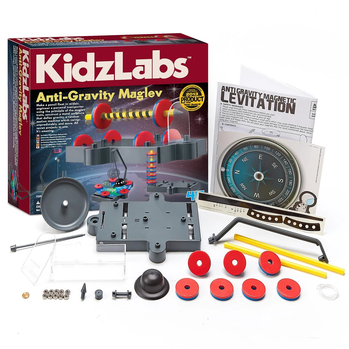 Цей набір допоможе краще пізнати магнітне поле і на що воно здатне. У коробці є інструкція, дотримуючись якої у дитини вийде зібрати різноманітні фігури. Потрібно спорудити якусь металеву конструкцію, за допомогою якої можна буде дізнатися про властивості магніту. В даному наборі можна зібрати 7 цікавих проектів: антигравітаційну скульптуру, плаваючий вертоліт, магнітний компас, магнітні ваги, магнітну пружину, маятник НЛО і поїзд на магнітній подушці.