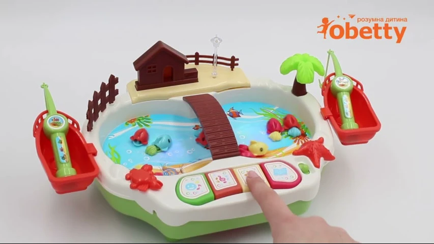 Не знаєте, що подарувати маленькому бешкетнику? Звісно ж, набір для риболовлі! Перед вами цікава багатофункціональна іграшка, яка надовго захопить вашу дитину та позитивно вплине на її розвиток. Тут розташовані водоймище, місток і будиночок з підсвічуванням. На корпусі іграшки є кнопки, що відповідають за відтворення різних мелодій і звуків. Набір укомплектований парою вудок і, звичайно, підводними мешканцями. Вдалої риболовлі!