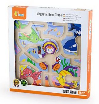 Барвистий підводний світ захопить дитину і його друзів на довгий час. Під час гри розвиваються соціальні навички. Кольорові кульки по лабіринту потрібно провести за допомогою магнітних паличок. У кожного мешканця водного світу свій колір кульок: у черепашки зелені кульки, у дельфіна - сині кульки, у рибки-клоуна - жовті кульки, у восьминога - бордові кульки, у водолаза - фіолетові кульки. Прозора пластикова панель не дряпається, магнітні палички прикріплені до корпусу на шнурках. Магнітний лабіринт зроблений з екологічно чистих матеріалів.