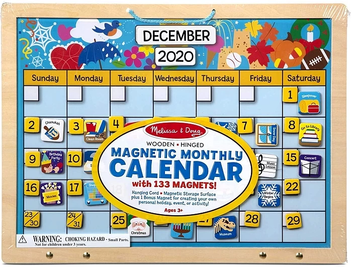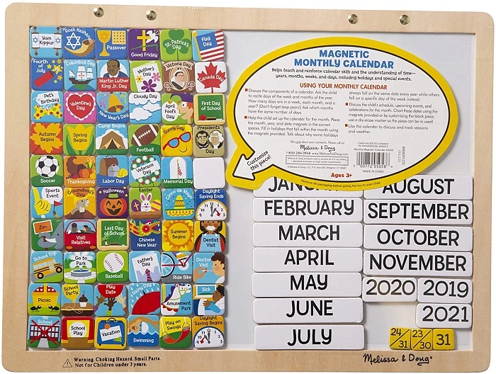 Даний календар допоможе розвинути почуття часу і навчить орієнтуватися в датах. На магнітний шаблон необхідно закріпити назву місяця і відповідний рік. Є магніти, що зображують важливі події, їх необхідно розставити на важливі для дитини дати. Можна дивитися на календар і планувати святкування днів народжень близьких, відвідування лікаря, гуртків, заходів і т.д. Місяці і роки змінюються вгорі календаря, тому він і називається вічним.