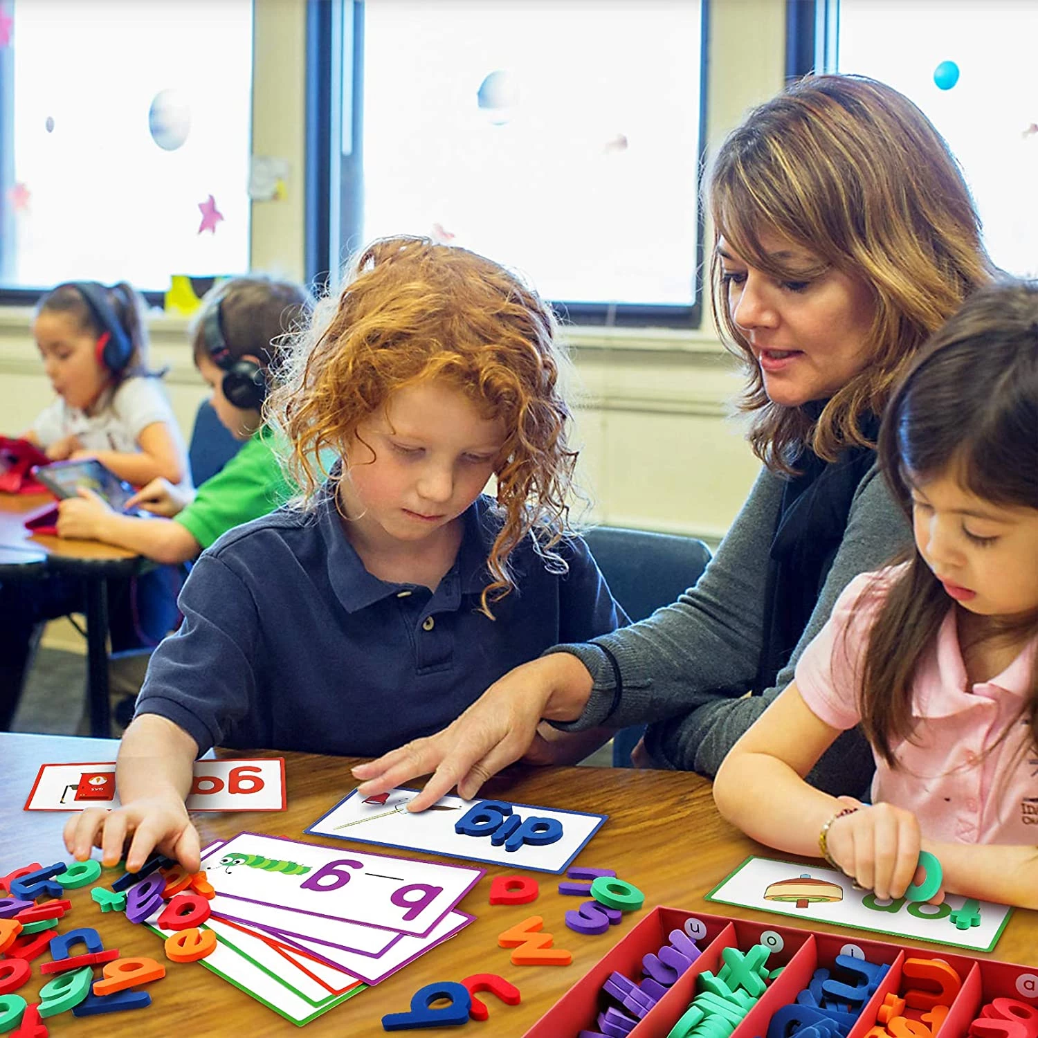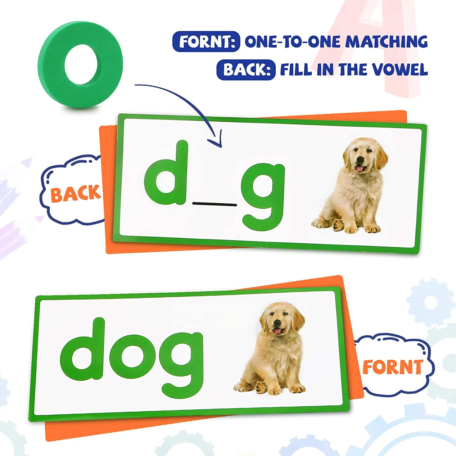 Цей набір допоможе дитині в ігровій формі навчитися складати короткі слова. Різні кольори букв допомагають швидко орієнтуватися серед них і вибирати необхідні. Це прекрасний матеріал для практичних занять з англійської мови. У комплекті дуже багато карток із завданнями, які діткам цікаво виконувати. В якості допомоги, на картках є відповідне малюнки. Згодні і голосні навіть мають колірне кодування, щоб полегшити побудову слів! Це відмінний набір для занять в школі або вдома. Вологовідштовхувальним поверхню карток і стирається маркер, роблять комплект довговічним і багаторазовим.