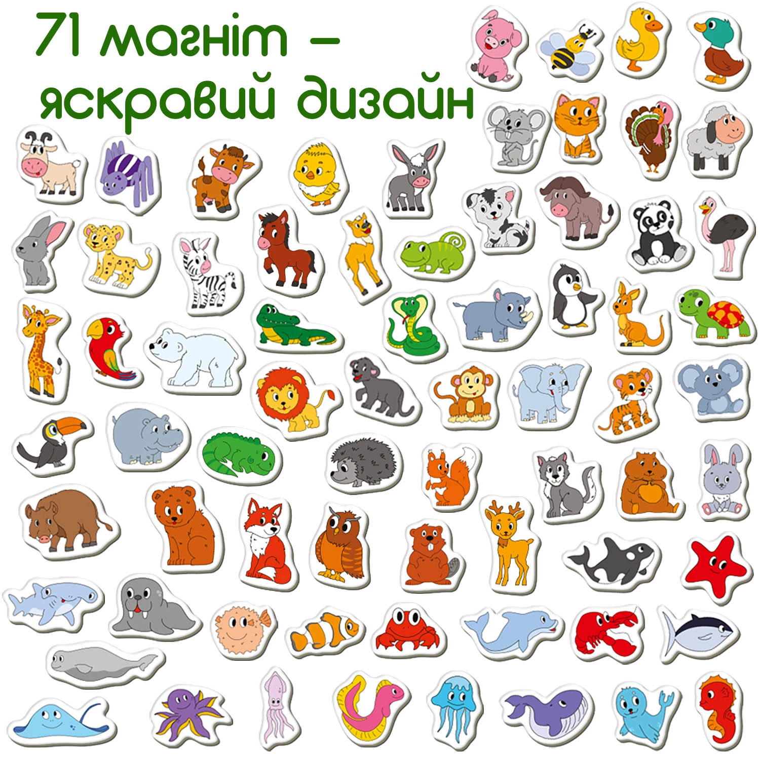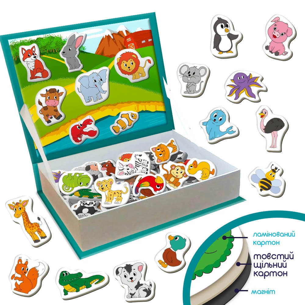 Пропоновані магнітні фігурки познайомлять дитину з домашніми, дикими та екзотичними тваринами, а також мешканцями морів та океанів.