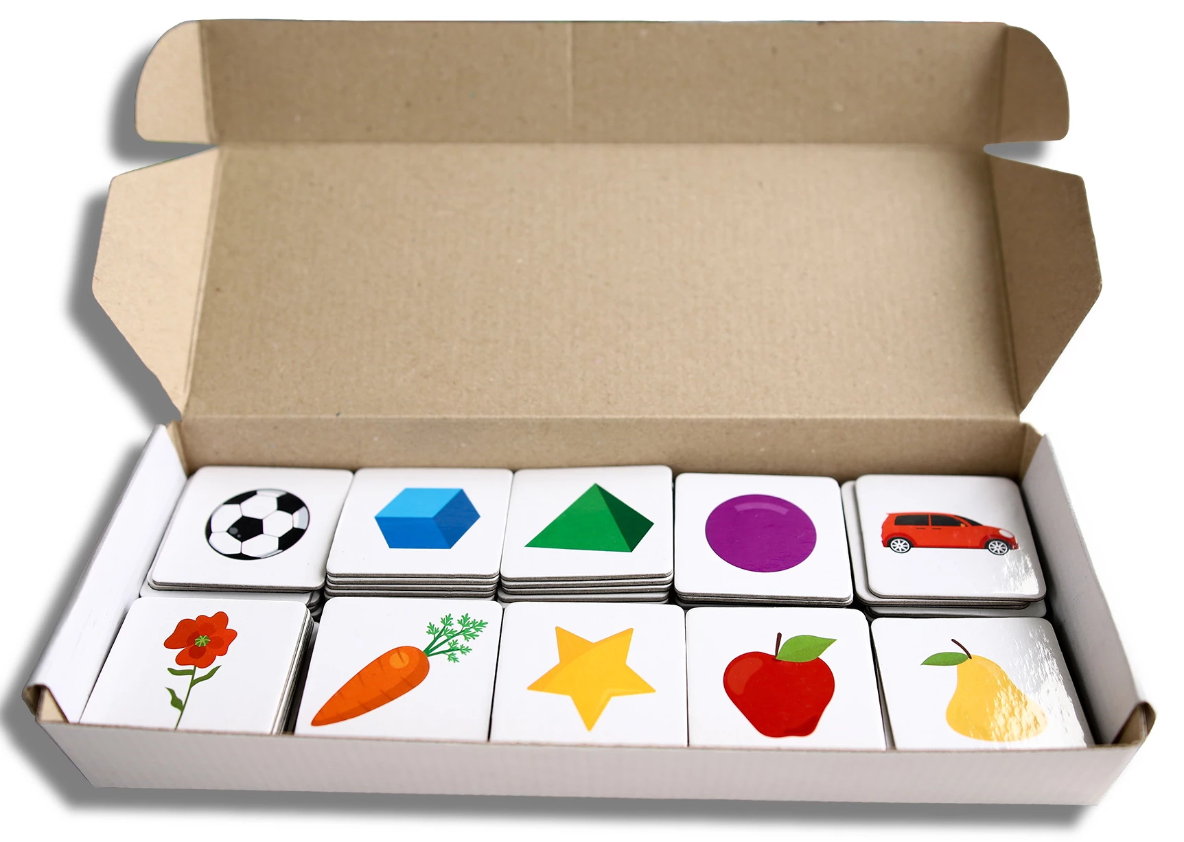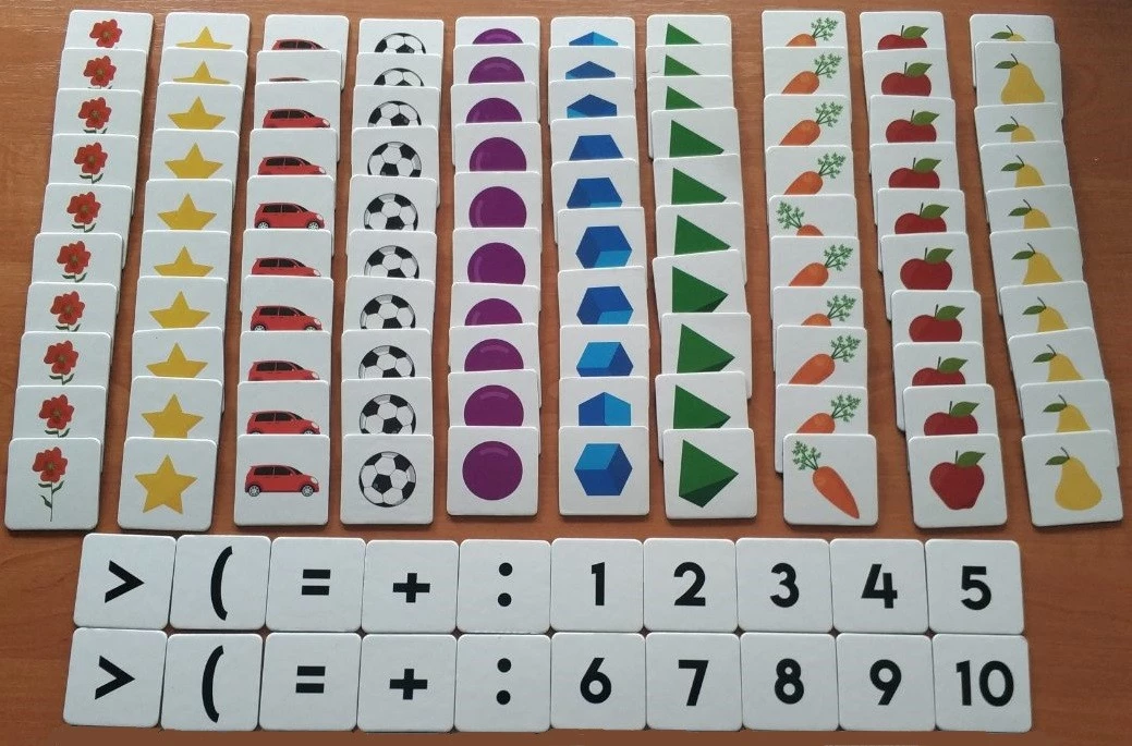 Предметні фігури: яблуко (10 шт), груша (10 шт), морква (10 шт), квіточка (10 шт), машина (10 шт), зірка(10 шт); спортивний м'яч (10 шт).