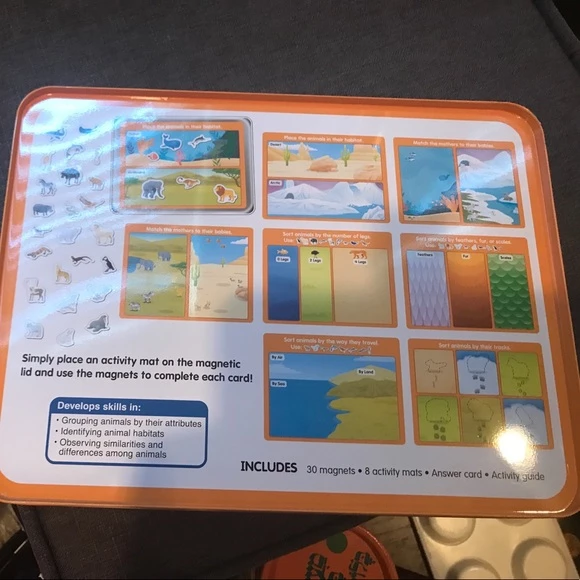 Познайомимося з тваринами ще більше? Саме в цьому наборі зробити це максимально просто: на магнітну кришку прикріпіть одну з восьми карток активності і виконуйте завдання, використовуючи запропоновані в комплекті магнітні деталі! Така робота відмінно позначиться на вмінні малюка розрізняти різних тварин, логічно думати, сортувати і ще багатьох навичок! Ну а досить великий асортимент набору (8 карток, 30 магнітів) зробить гру різноманітною і не дасть дитині занудьгувати!
