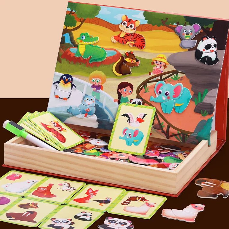 Порадуйте дитину цікавим подарунком, який відкриє для нього дивовижний світ творчості, — магнітним пазлом «Тварини». Розвивальний набір у зручній дерев'яній валізці захопить дитину і допоможе їй тренувати дрібну моторику, а також познайомить з різноманітними представниками фауни.