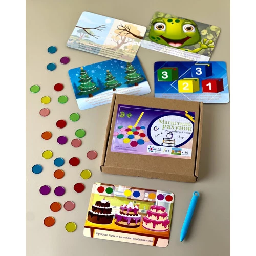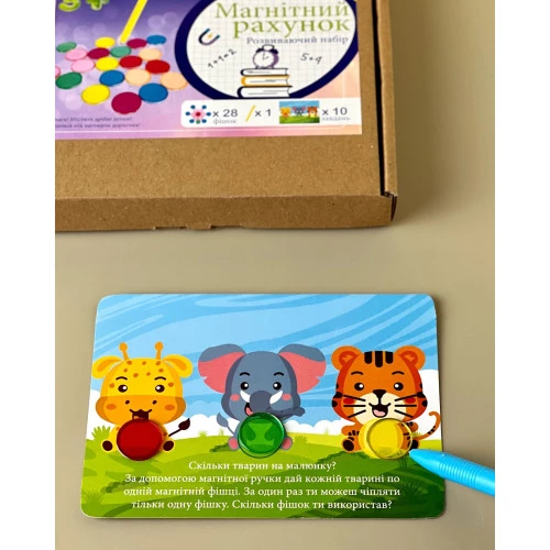 Пропонуємо до вашої уваги захопливу магнітну гру з картками, яка називається «Магнітний рахунок». Набір включає 10 цікавих і корисних завдань, яких вистачить надовго, щоб займатися з дитиною. В комплект входить 28 різнокольорових магнітних фішок та спеціальна магнітна ручка для зручного переміщення фішок. У процесі гри малюк познайомиться з поняттями «більше» і «менше», вчитиметься рахувати, орієнтуватися в просторі, сортуватиме фішки відповідно до чисел. Ігровий набір сприяє розвитку логічного та просторового мислення, дрібної моторики та інших навичок.