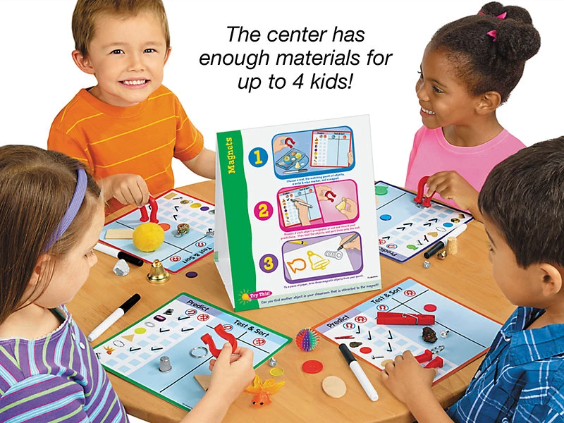 Даний навчальний набір навчить дітей розбиратися в магнітах і в їх властивостях. Щоб почати грати, потрібно розкласти всі практичні матеріали та картки з вправами. Дітям належить сортувати об'єкти, визначати магнітні предмети. Набір підходить для гри 4-х дітей одночасно, в легкій інструкції наочно показано, як правильно використовувати навчальні матеріали. Кожному гравцеві видається спеціальне ігрове поле, на якому можна писати стираючими маркерами.