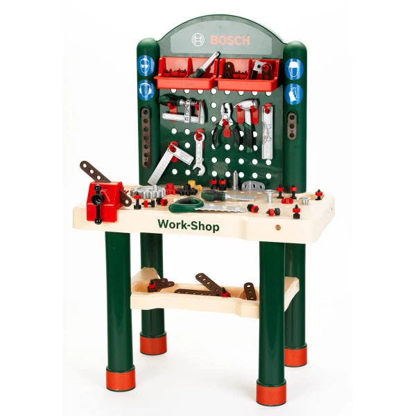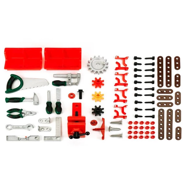 Основою набору служить верстак зі стінкою, оснащеною гачками для інструментів та полицями. Він легко збирається за допомогою покрокової інструкції, що входить до комплекту. Стільниця має велику робочу поверхню, адаптовану для дитини. Інструменти з набору можна розміщувати на поличках або повісити на вертикальну частину верстата.