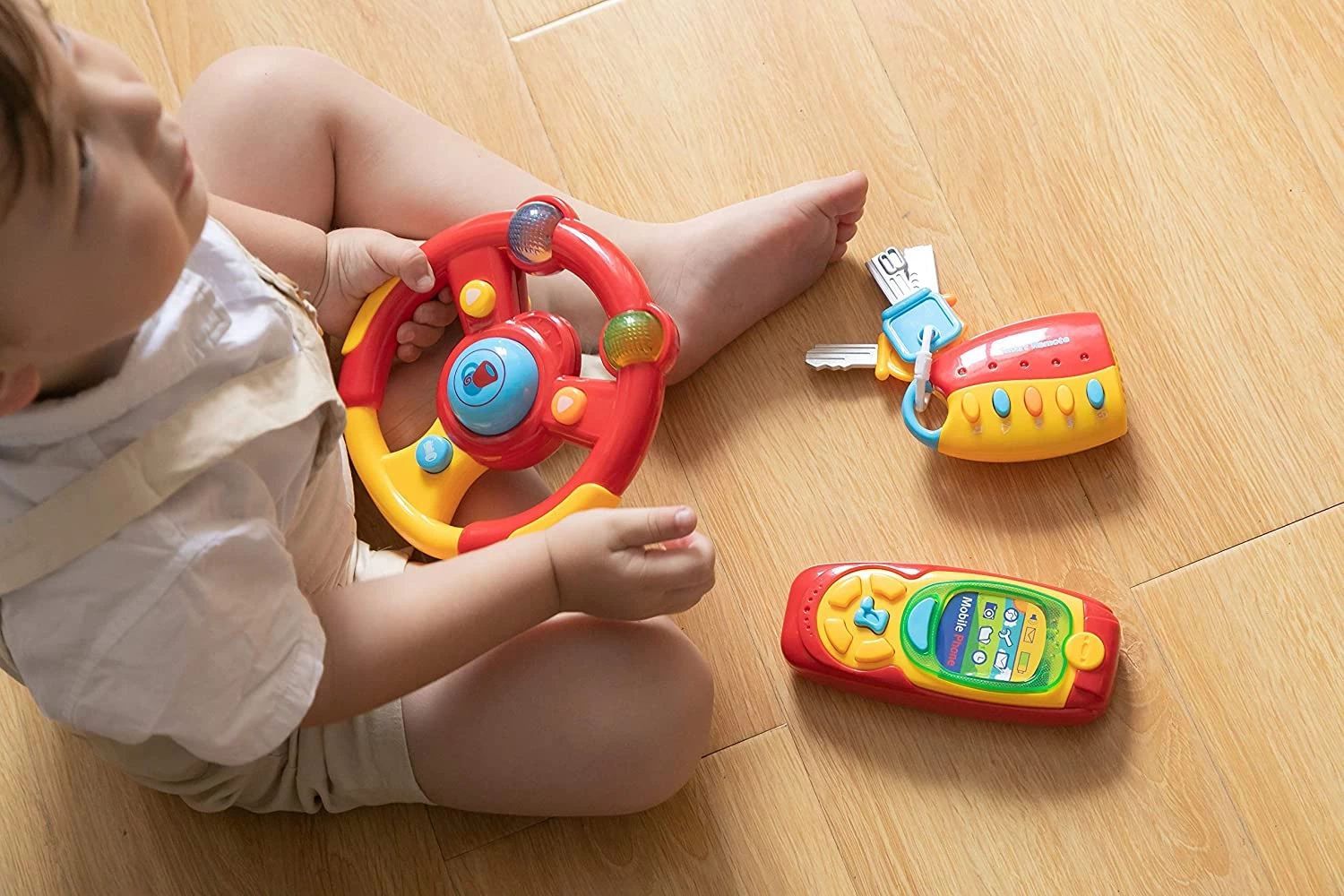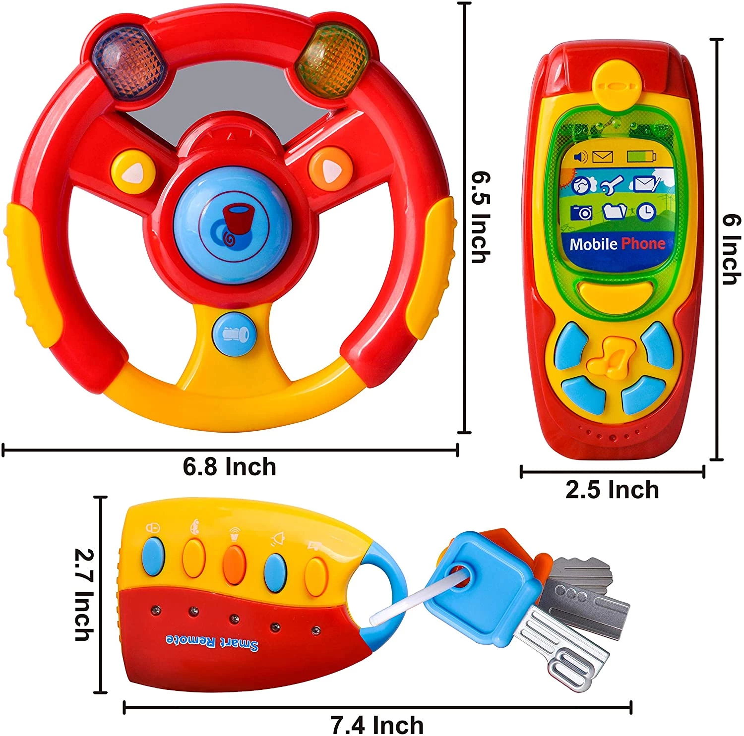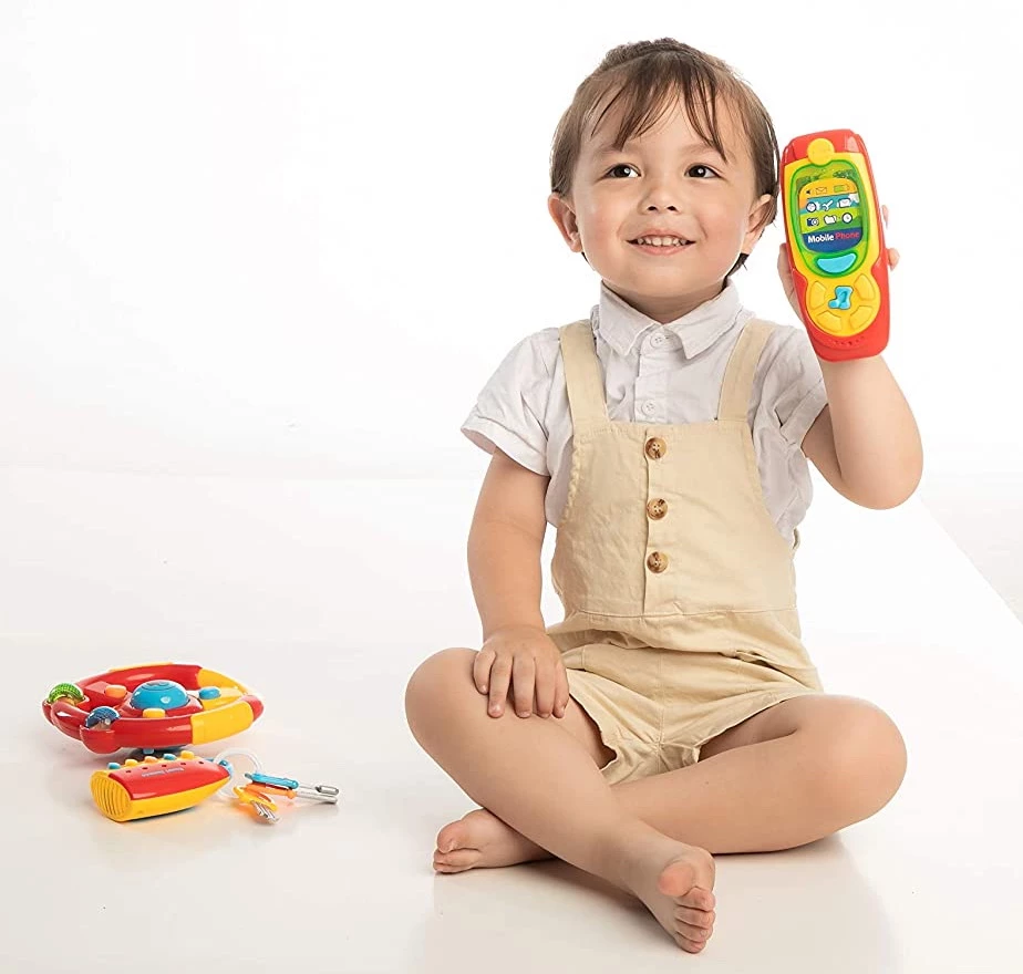 Красивий і цікавий набір інтерактивних іграшок - це прекрасний подарунок на будь-яке свято. Тут ключі від автомобіля, кермо та мобільний телефон, видають всілякі звуки і світлові ефекти. На кожному з гаджетів є кнопки, які можна натискати. Гра з таким набором прекрасно розвиває сенсомоторіку і слухове сприйняття. Дитина може уявляти себе справжнім автомобілістом і водієм.