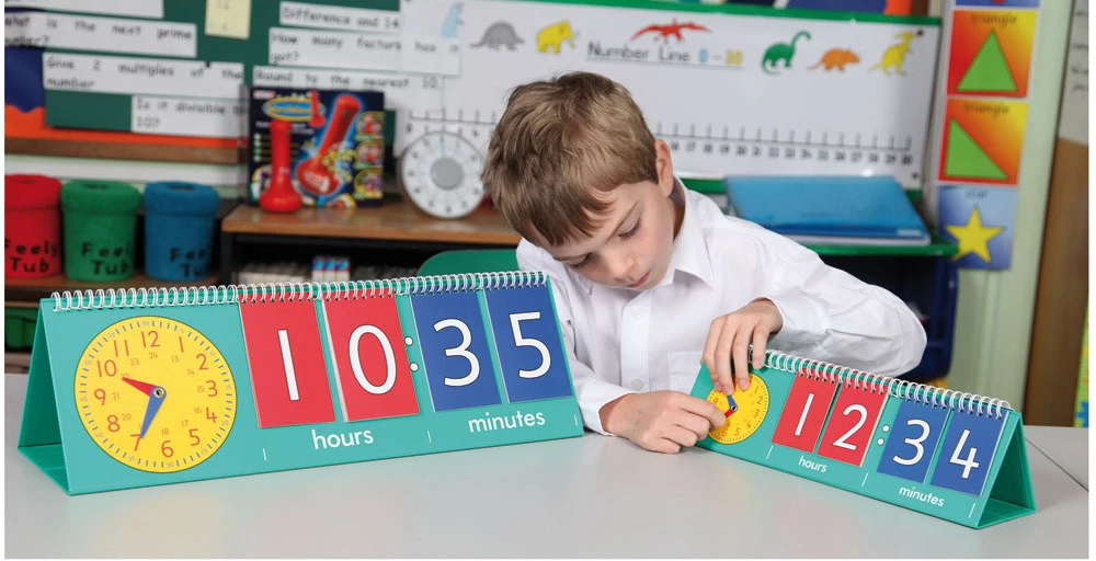 Ефективне вивчення часу: аналогове і цифрове, за допомогою цього годинника-фліпчартів, що показують 12-годинний циферблат і цифри для 24-годинного або 12-годинного цифрового часу.