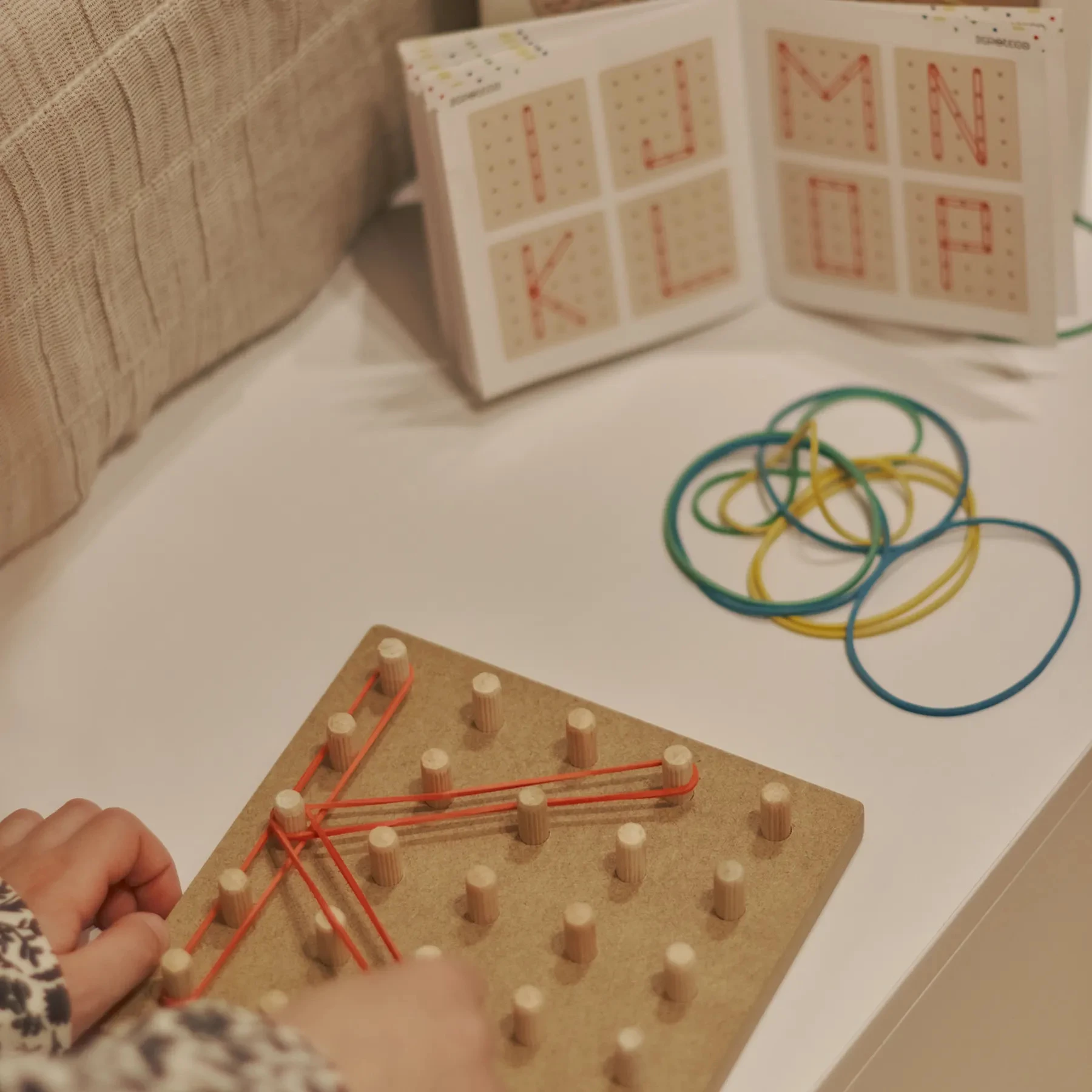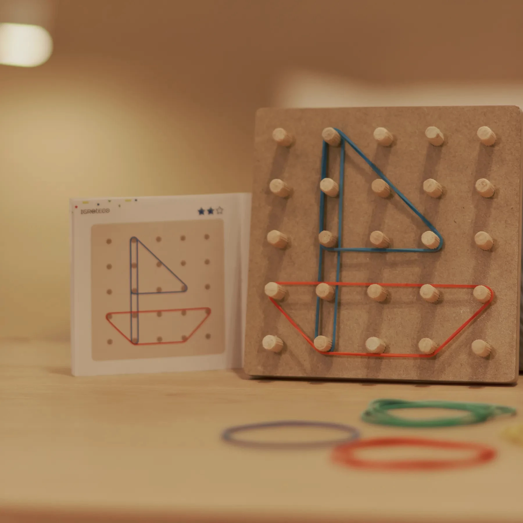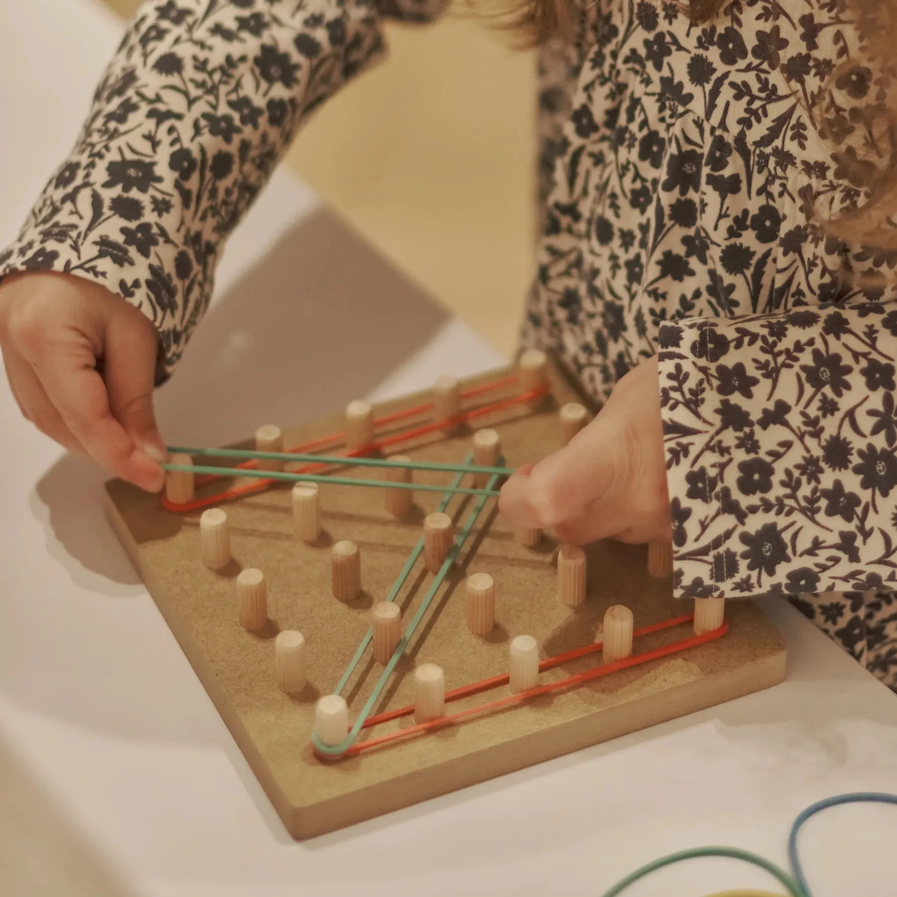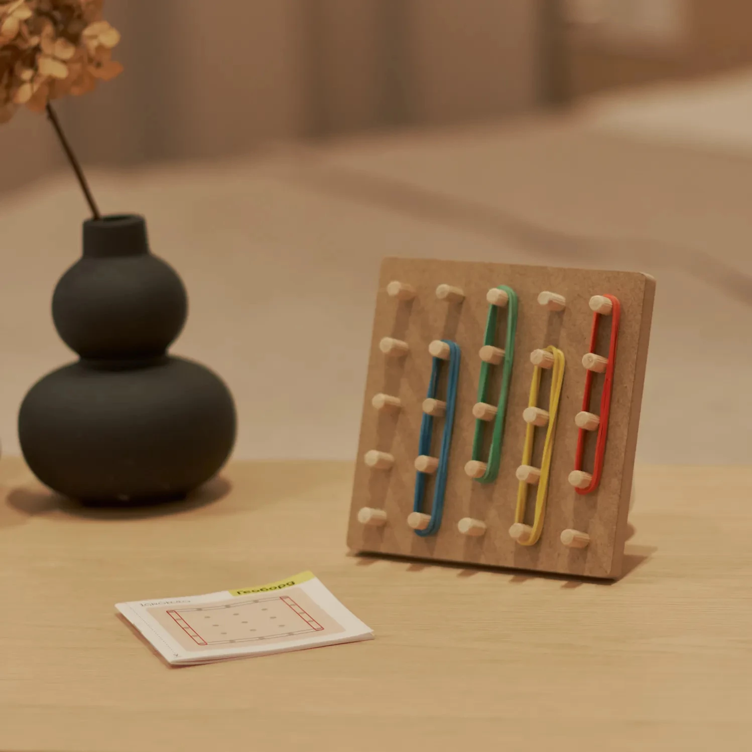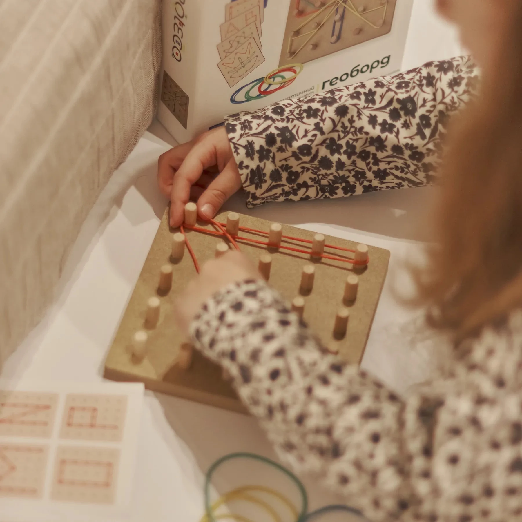 У процесі гри у дитини вдосконалюватиметься дрібна моторика, оскільки натягування гумок вимагатиме точних рухів. Крім того, навчальний набір познайомить й з основами геометрії.