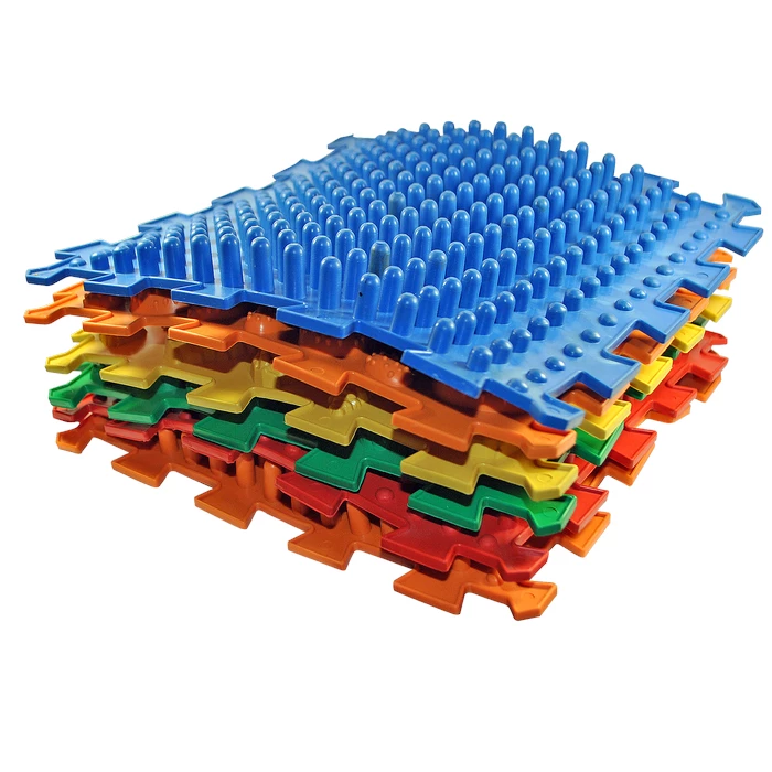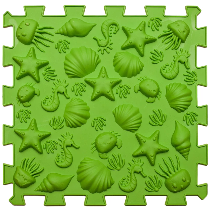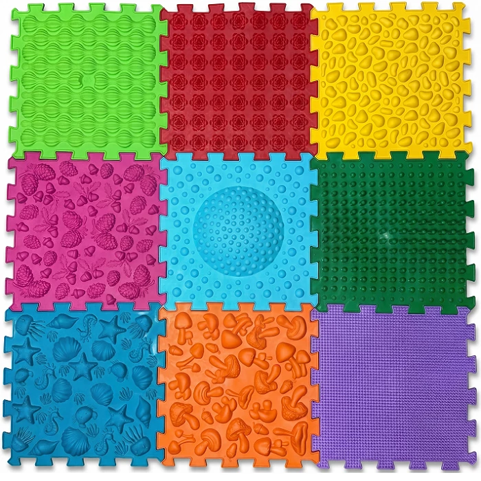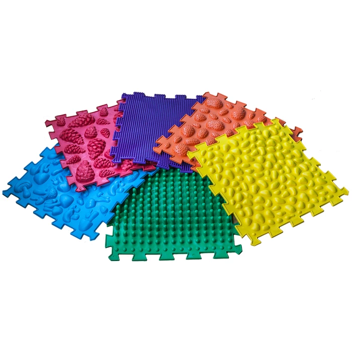 Всі модулі виготовлені з безпечного гіпоалергенного ПВХ, який не містить шкідливих домішок та абсолютно нешкідливий. Унікальність набору полягає у поєднанні різних фактур, що забезпечують різний рівень інтенсивності впливу. Елементи з імітацією трави, черепашок чи дрібної гальки відносяться до м'якого типу покриття. Середню жорсткість забезпечують модулі у вигляді морських зірок чи жолудів, а поверхні з шипами і шишками гарантують глибокий терапевтичний масаж. Комбінація різних текстур створює найкращий ефект для тренування зв'язок та якісної сенсорної інтеграції дитини.
