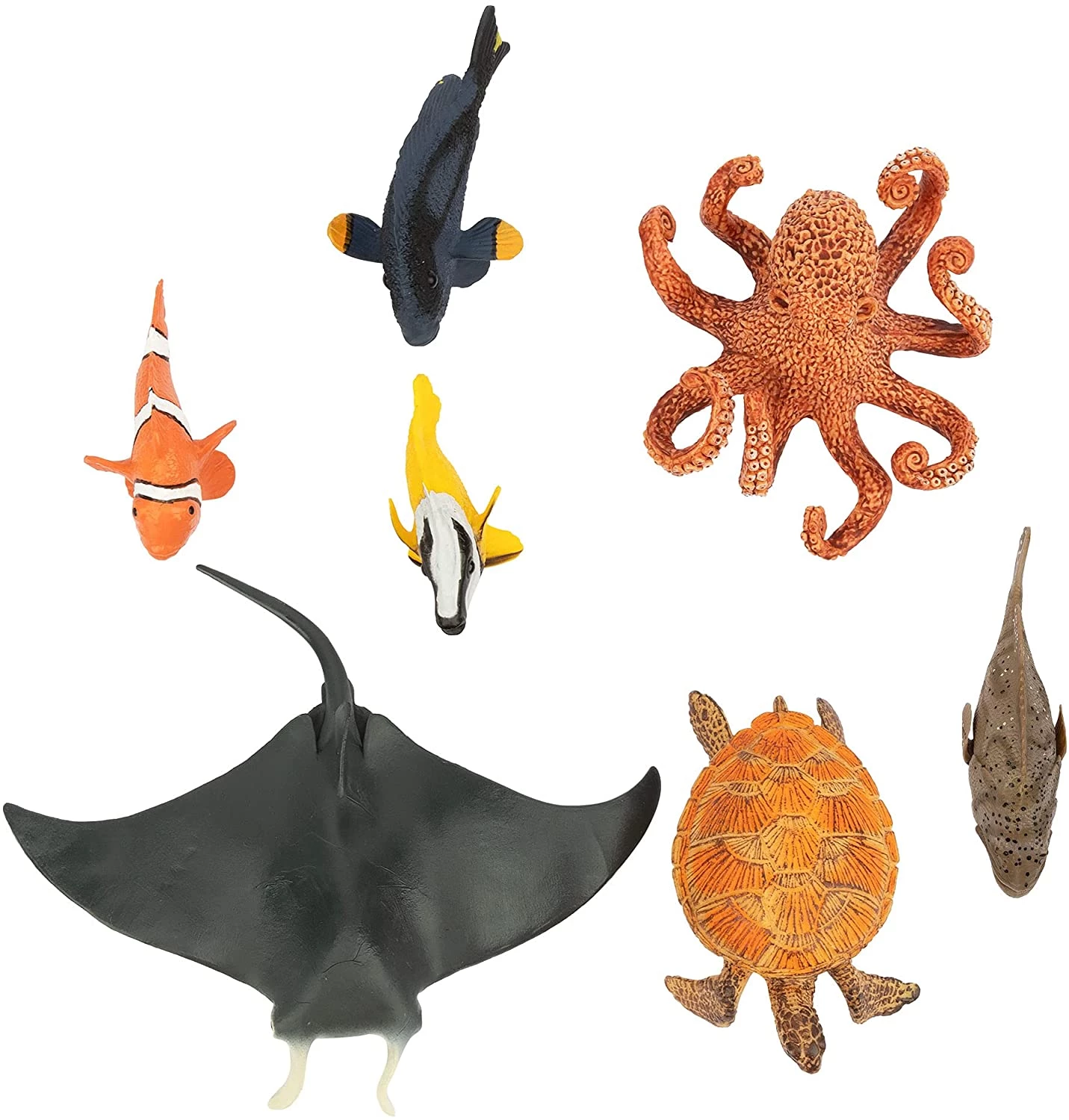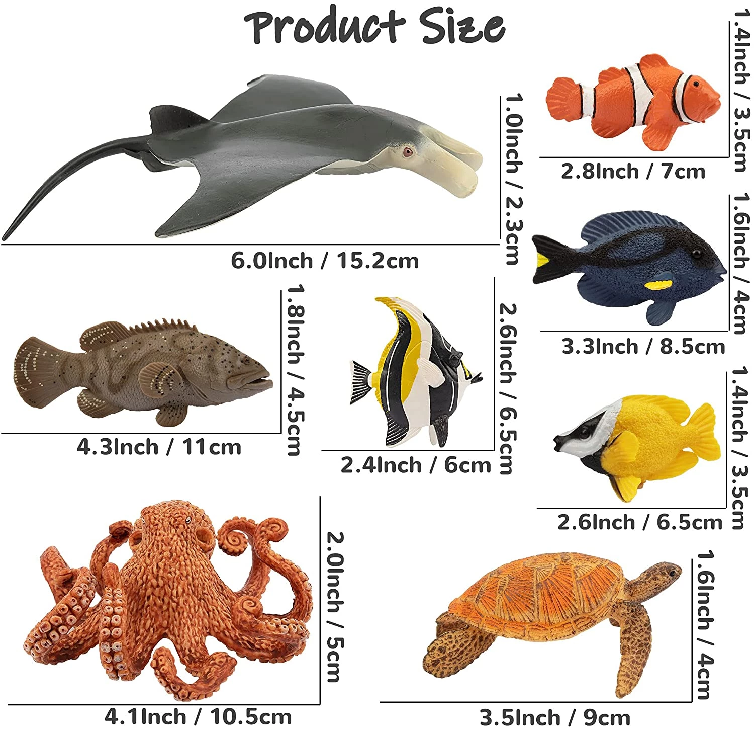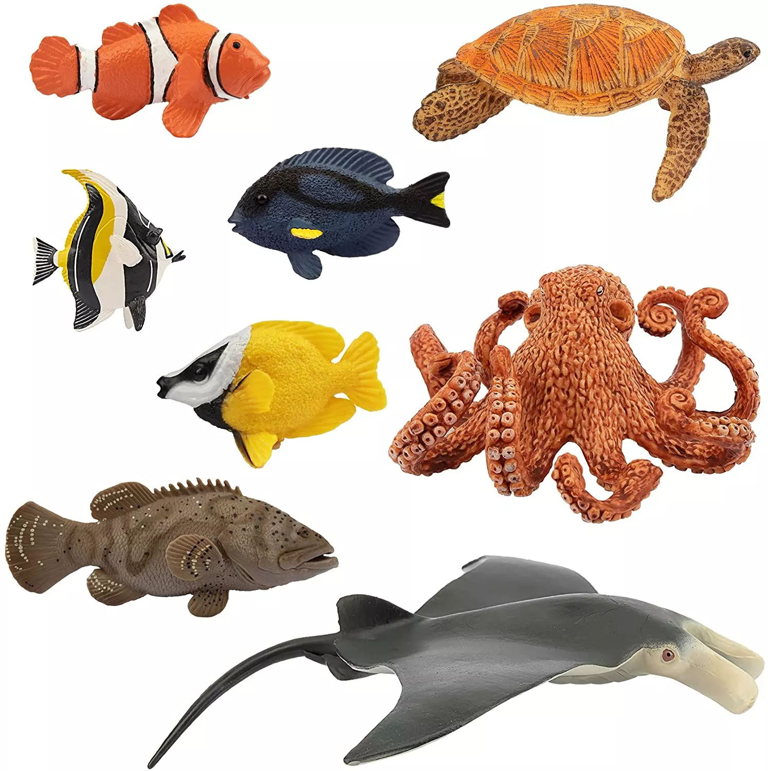 Набір реалістичних фігурок мешканців морського дна призначений для прикраси акваріума і різноманітних творчих ігор. Іграшки виконані з дуже якісного пластику, що відрізняється гіпоалергенність і довговічністю. Тут є морська черепаха, морський окунь, коралова рифова риба, риба блакитний хірург, риба-клоун, риба-кролик, скат мобула, восьминіг. Комплект може стати прекрасним подарунком для юного любителя морських істот.