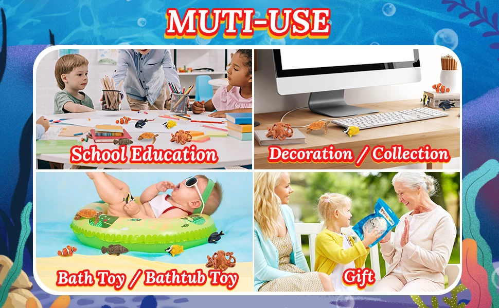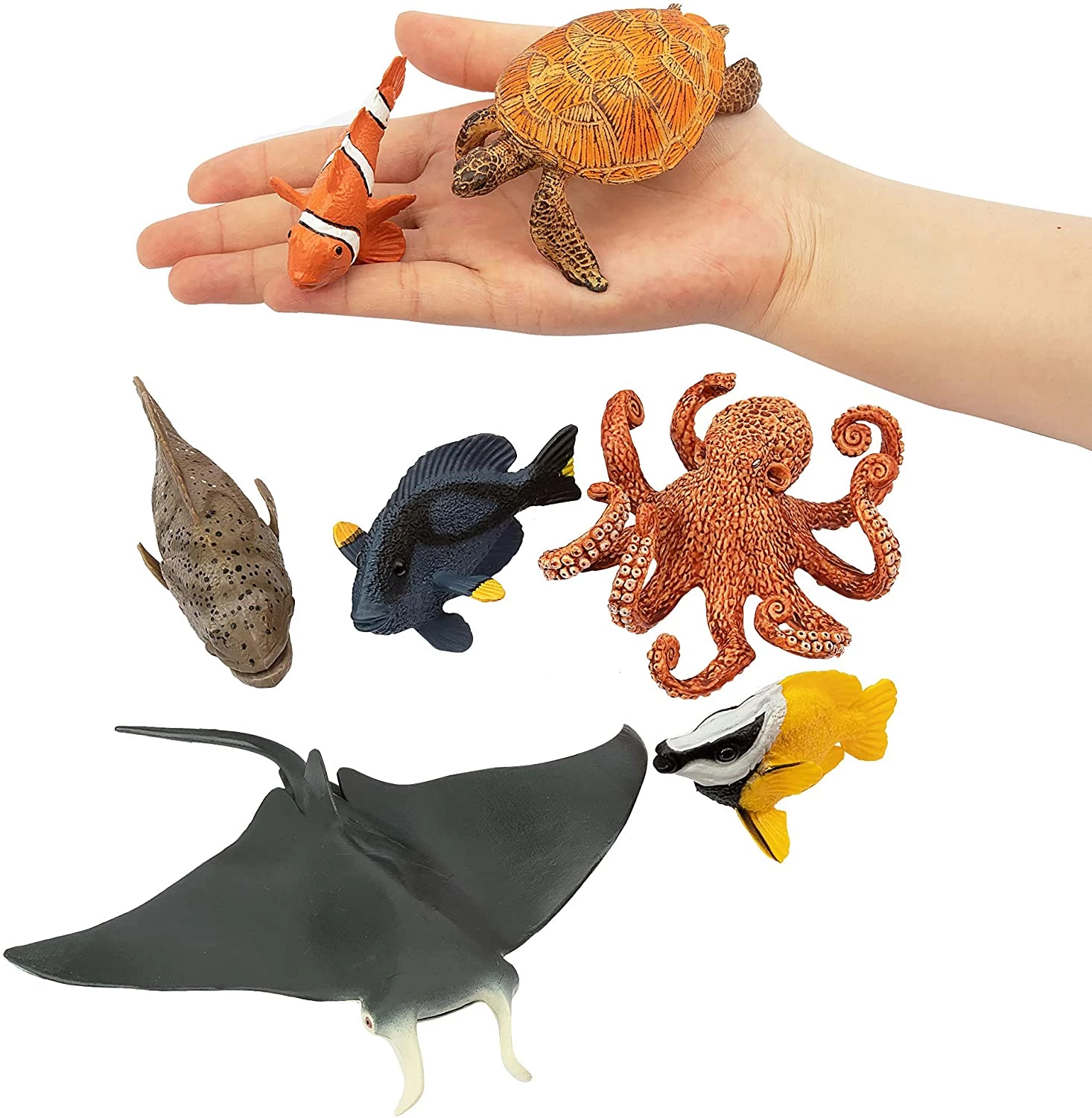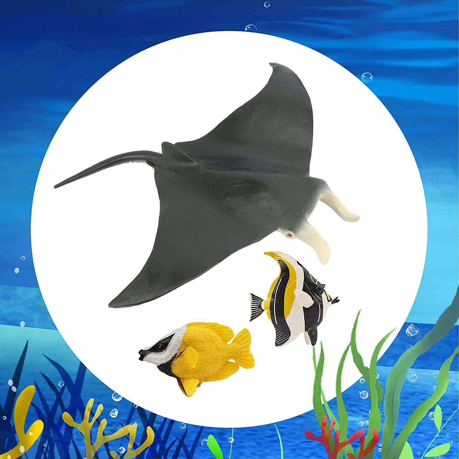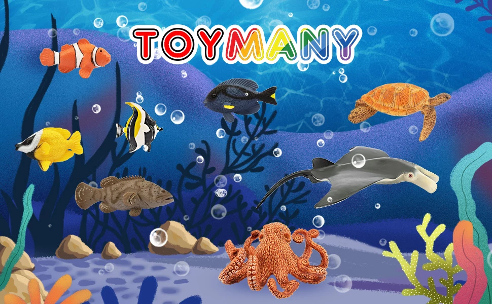 Набір реалістичних фігурок мешканців морського дна призначений для прикраси акваріума і різноманітних творчих ігор. Іграшки виконані з дуже якісного пластику, що відрізняється гіпоалергенність і довговічністю. Тут є морська черепаха, морський окунь, коралова рифова риба, риба блакитний хірург, риба-клоун, риба-кролик, скат мобула, восьминіг. Комплект може стати прекрасним подарунком для юного любителя морських істот.