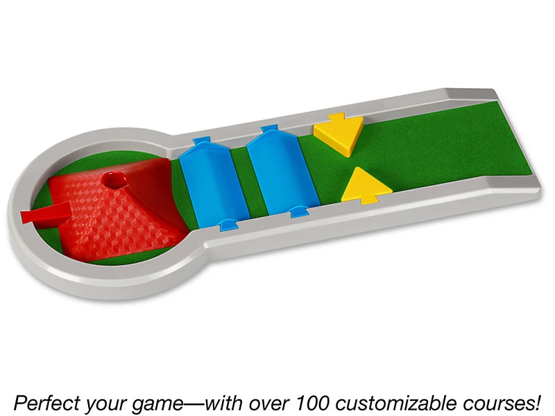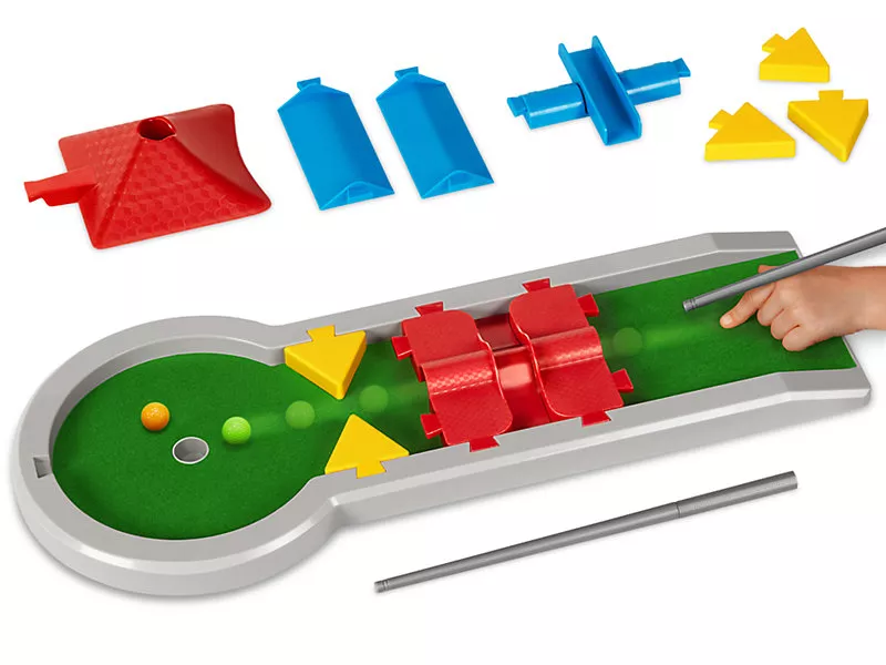 Ця гра в міні-гольф займе дітей на довгий час. Грати в нього можна прямо на столі! Завдяки тунелям, пандусам і іншим перешкодам, діти можуть створити понад 100 полів. Припіднята частина поля дозволить легко керувати києм і штовхати кульки.