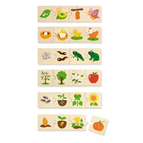Вивчити різні фази розвитку тварин, комах і рослин можна під час гри з цими міні пазлами. Дитина повинна правильно зіставити і розсортувати елементи за категоріями. У кожній категорії 4 елемента пазла. Під час гри, дитина розвиває координацію роботи рук і очей.