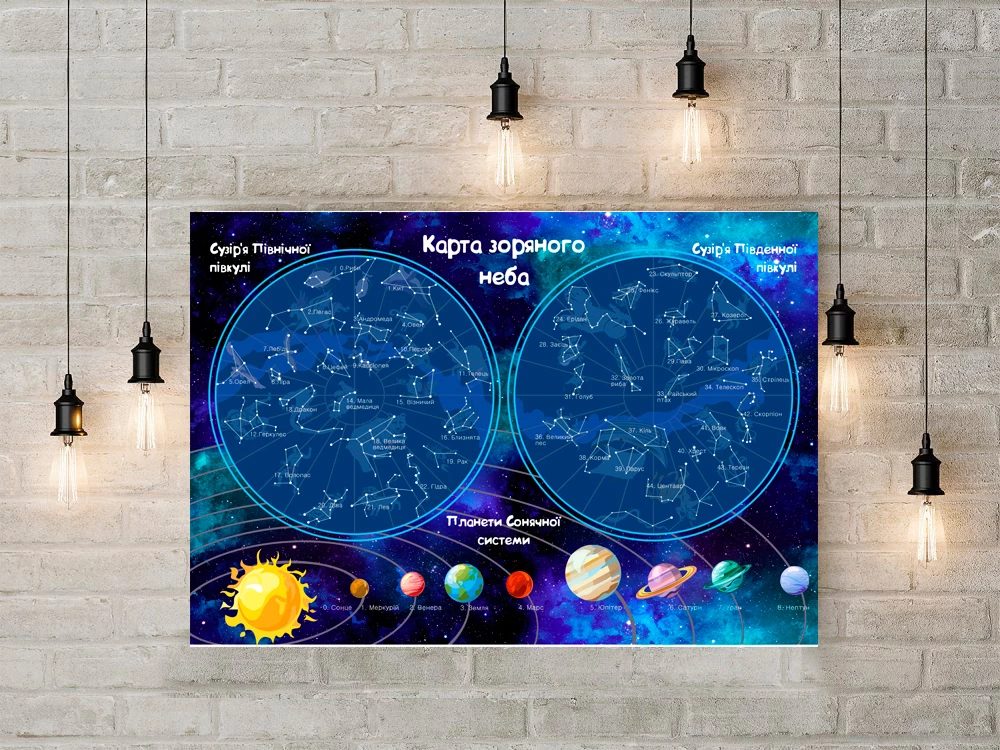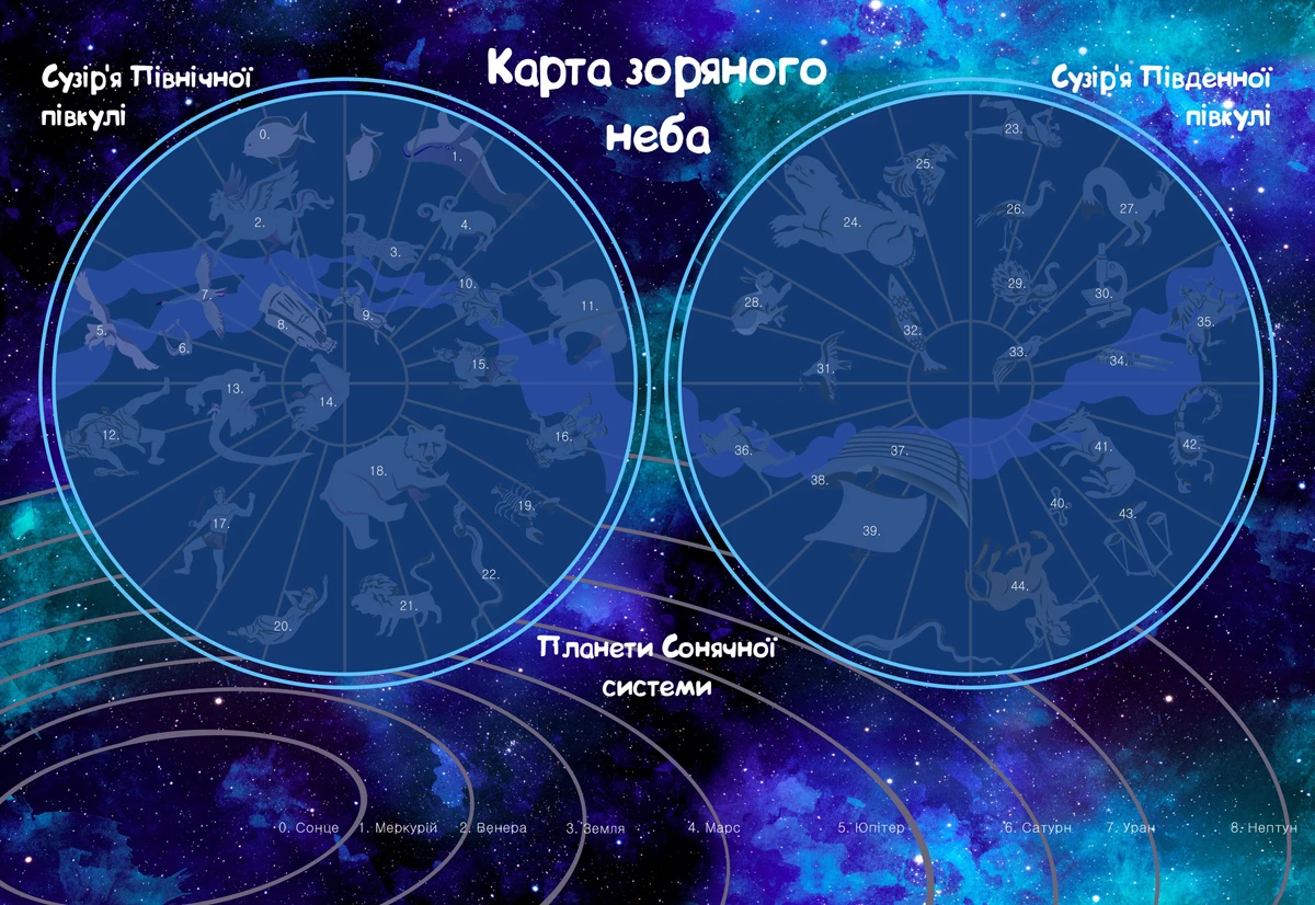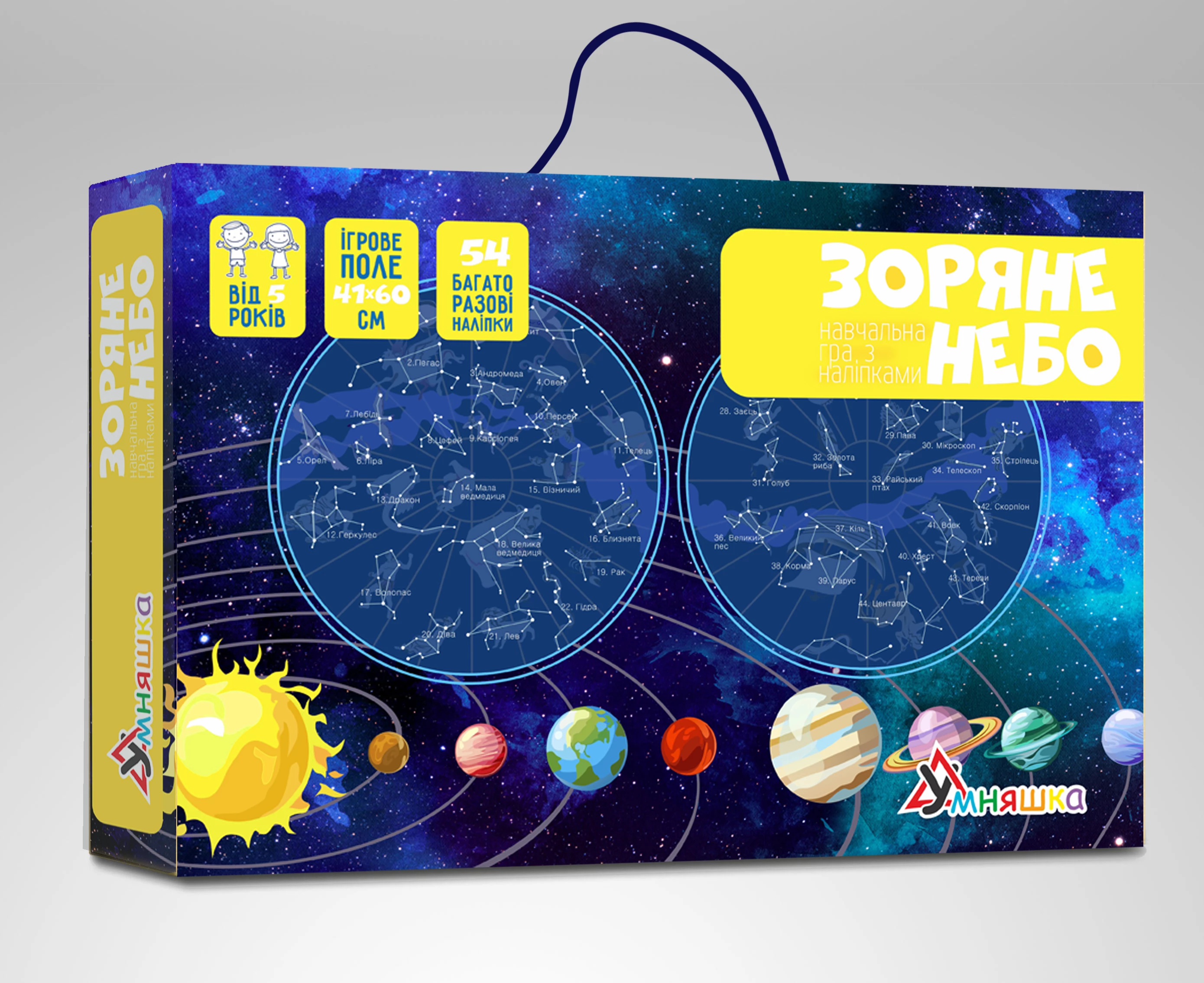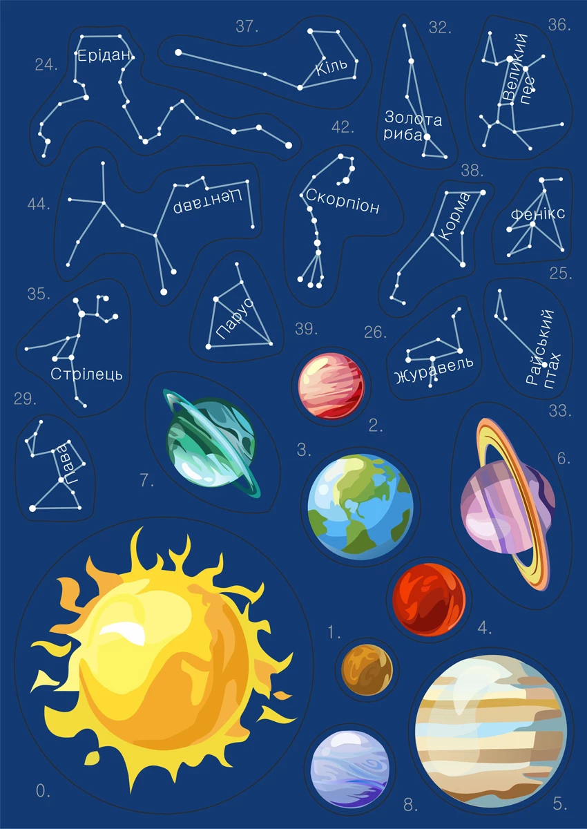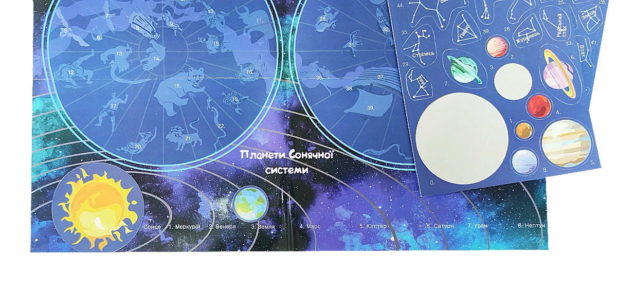 Рушайте в подорож по космосу і складіть карту зоряного неба! Це гра з багаторазовими наліпками, в якій дитині необхідно вивчати планети, небесні тіла і сузір'я. Готове ігрове поле ви можете використовувати як прикрасу дитячої кімнати.