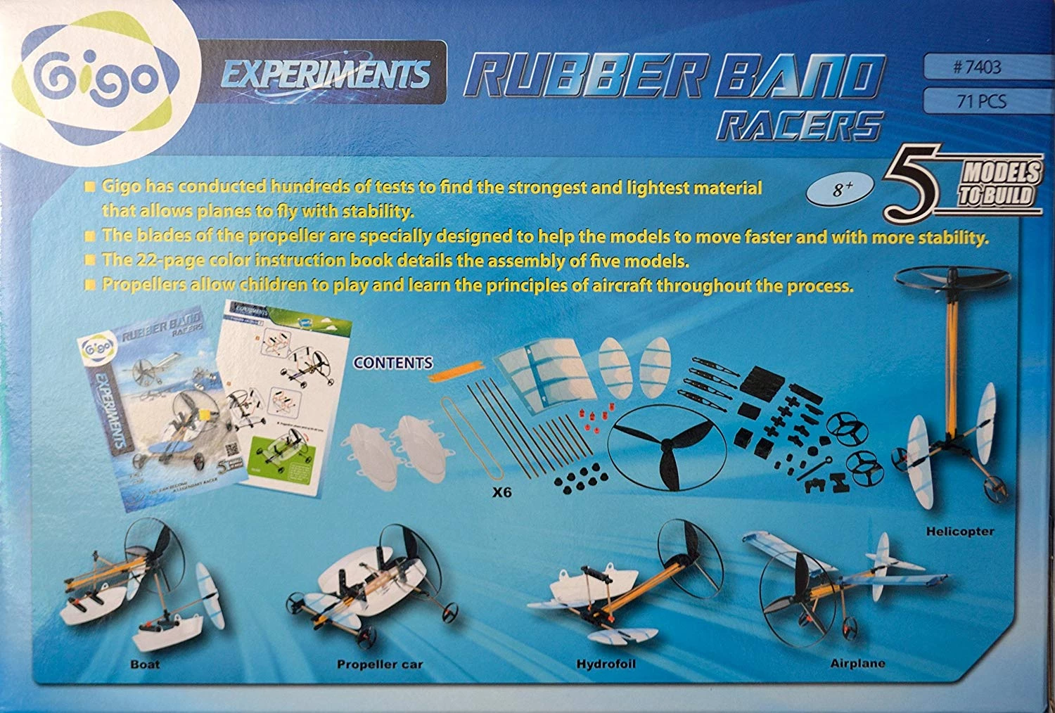 З цим набором діти зможуть збирати моделі з гумовим мотором. Використовуючи деталі і бамбукові палички - можна зібрати 5 різних моделей. Грати з моделями можна в приміщенні і на вулиці. Чудовий подарунок для юного інженера, який любить збирати моделі.