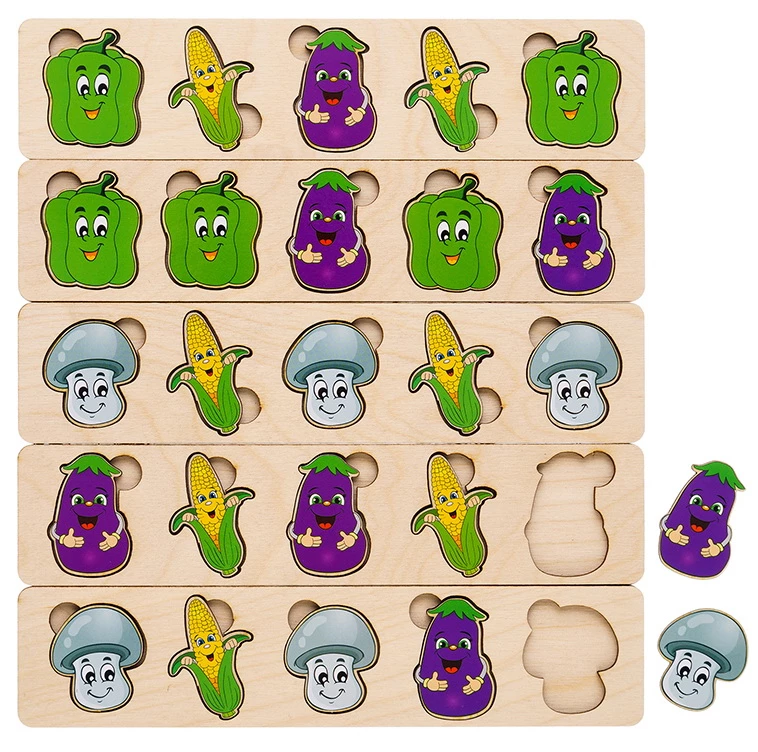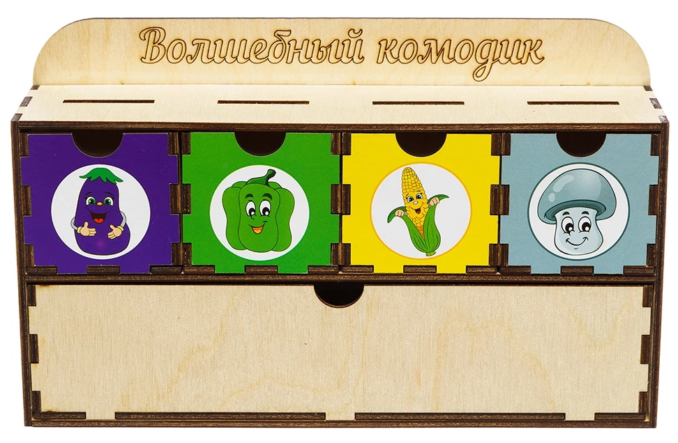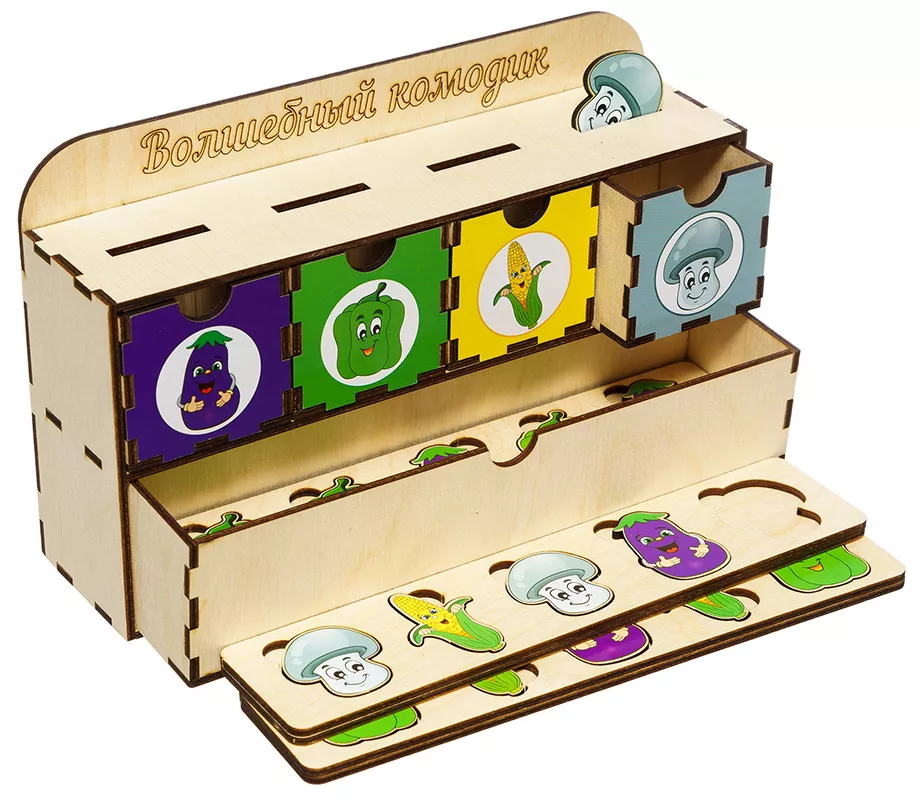 Чарівний комодик допоможе вивчити деякі види овочів і гриби, а також він сприяє розвитку дрібної моторики, уважності і пам'яті. Є осередки із зображенням баклажана, перцю, кукурудзи і гриба, в них необхідно розкласти 25 відповідних фігурок. Набір виконаний з дерева, має якісну збірку, його абсолютно безпечно використовувати для дітей. Він може стати чудовим подарунком на будь-яке свято як дівчинці, так і хлопчикові.