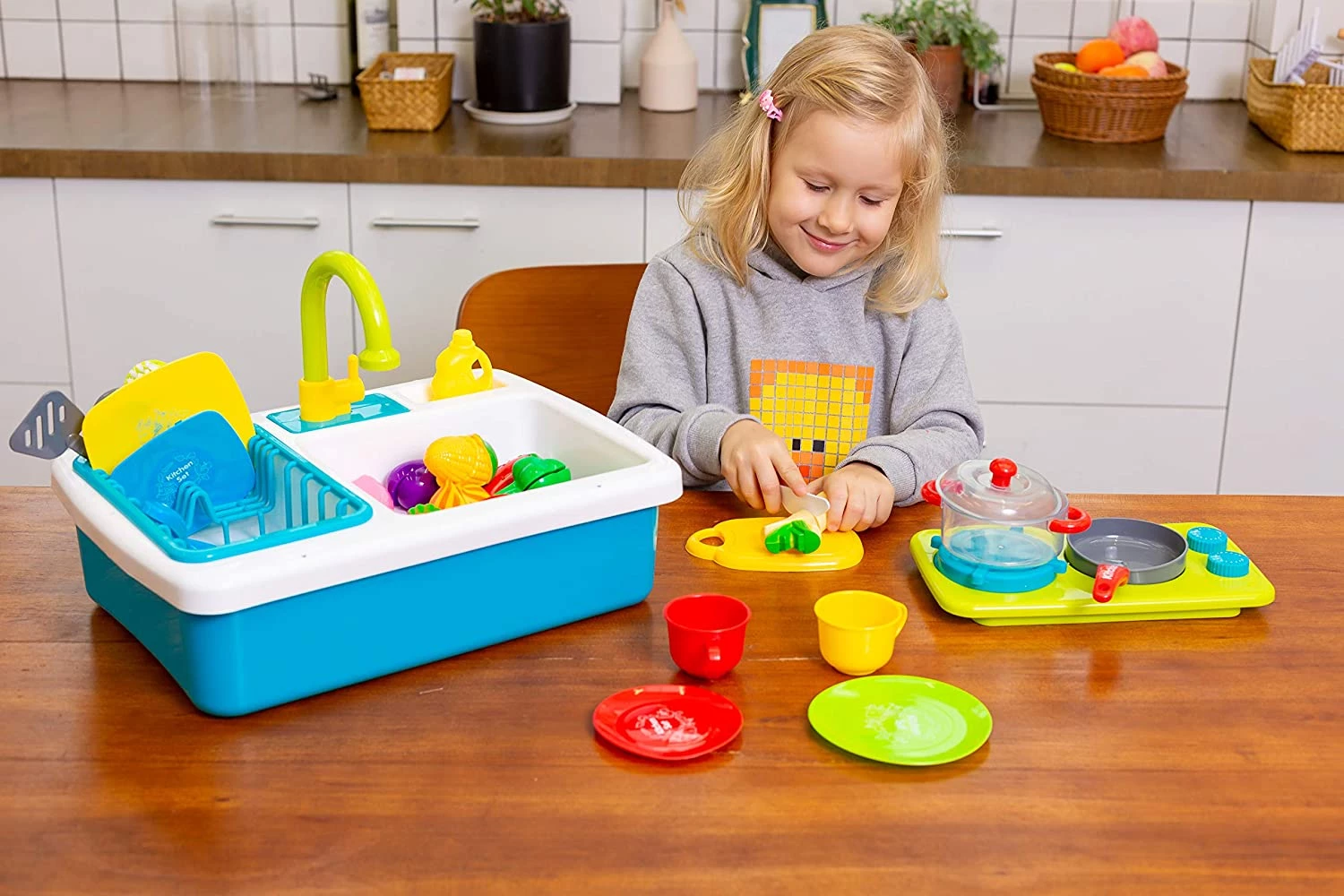 Ну що, хто завжди мріяв про те, щоб допомагати мамі на кухні? Тепер, з цим величезним набором, ви зможете приготувати що завгодно на власній маленькій кухні! Так, спочатку ви можете вимити необхідні інгредієнти або посуд під справжньою водою за допомогою раковини, пізніше розрізати овочі на кілька частин і приготувати їх в каструлі на стильній плиті!
