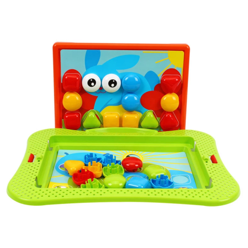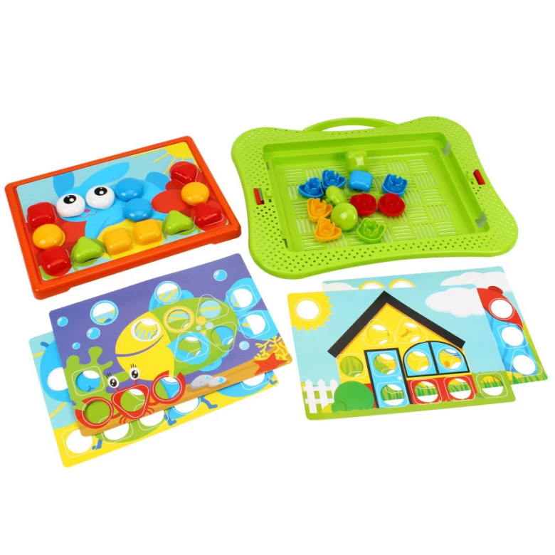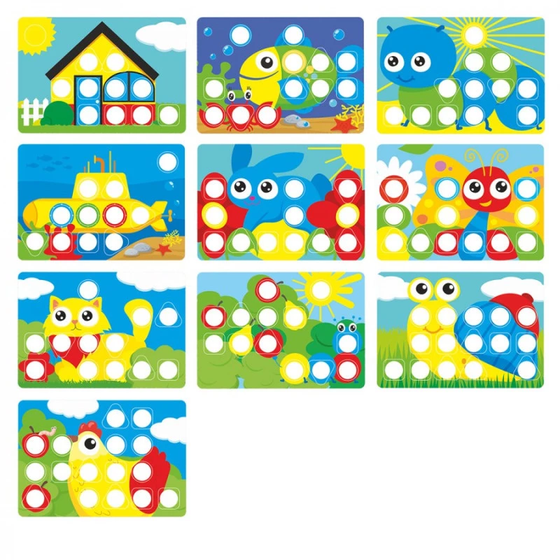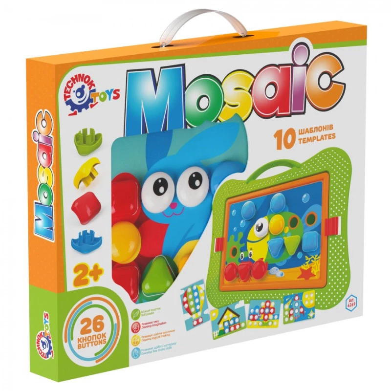 Фішки-кнопки в цій мозаїці не просто різнокольорові – вони ще мають різну форму. Крім того, на двох фішках зображені очі, завдяки чому картинки, які збере дитина з деталей мозаїки, оживуть.