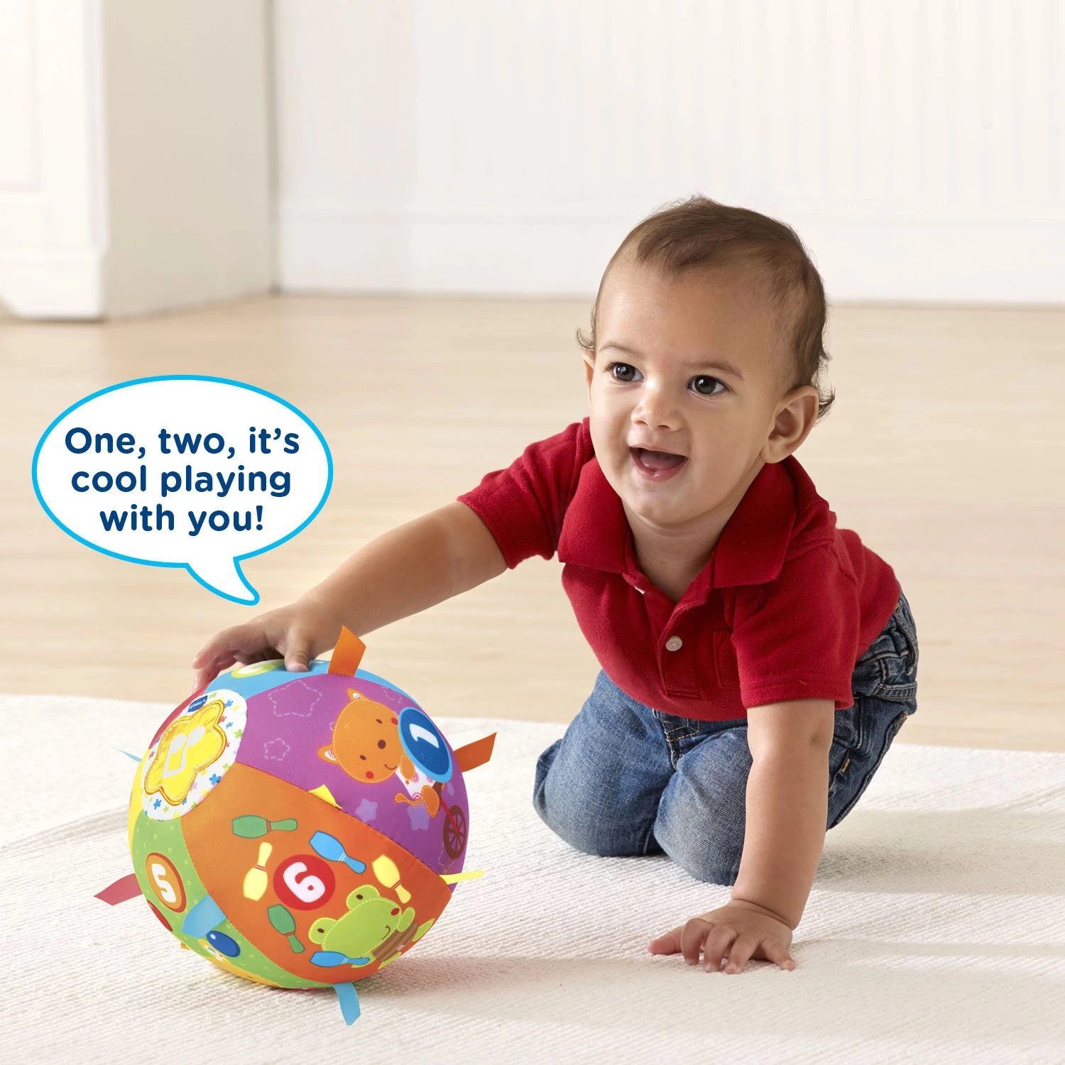 Плюшева іграшка у вигляді кульки для малюків відрізняється цікавими персонажами і яскравими кольорами. Малюкам сподобається повзати за м'ячиком. Навчальна іграшка має датчик руху, який запускає звуки і фрази. Велика кнопка у формі зірки, натиснувши на яку, дитина почує назви цифр і тварин. Кулька має м'які текстури і малюнки, які цікаві малюку і допомагають в тактильному розвитку.