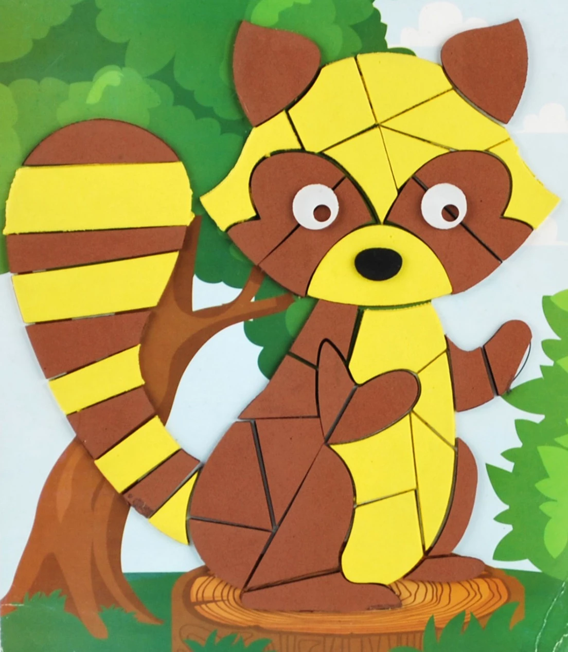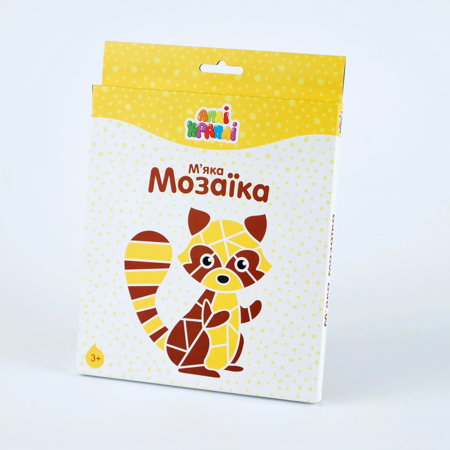 Кожен з елементів мозаїки потрібно розміщувати на листівці-заготовці у вказаному місці. Після того, як творча робота буде виконана, малюк зможе насолодитися барвистим малюнком із зображенням миленького єнота. Робота з м'якою мозаїкою ще й допоможе малюкам зняти напругу, заспокоїти нервову систему.