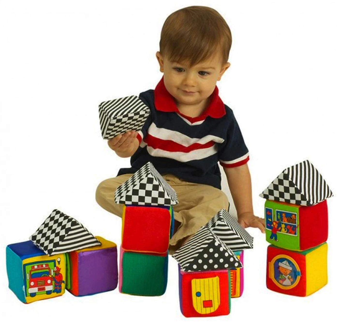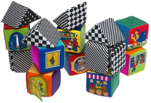 Даний набір відмінно підійде для дітей, щоб навчити їх будувати і розвинути дрібну моторику. М'які кубики видають різні звуки, одні гримлять, інші шарудять і т.д. Поверхні кубиків добре миються, тому їх можна брати з собою на прогулянку. Можна будувати будиночки, придумувати різні історії з ними або просто кидатися ними. На деяких кубиках можна відкривати віконця або дверки.