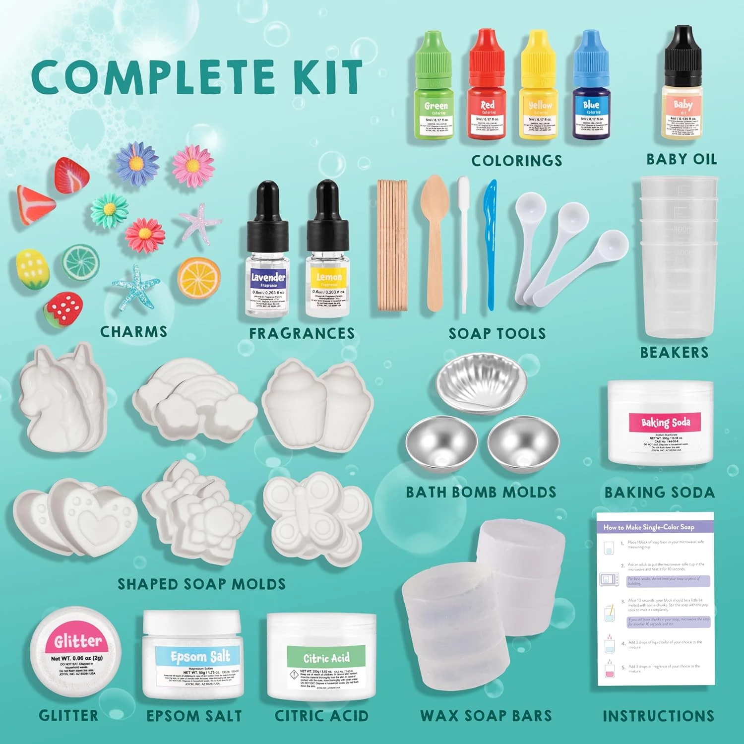 У набір для створення бомбочок для ванни і мила входить все необхідне. У комплекті є лимонна кислота, бікарбонат натрію, англійська сіль та інші компоненти та аксесуари.