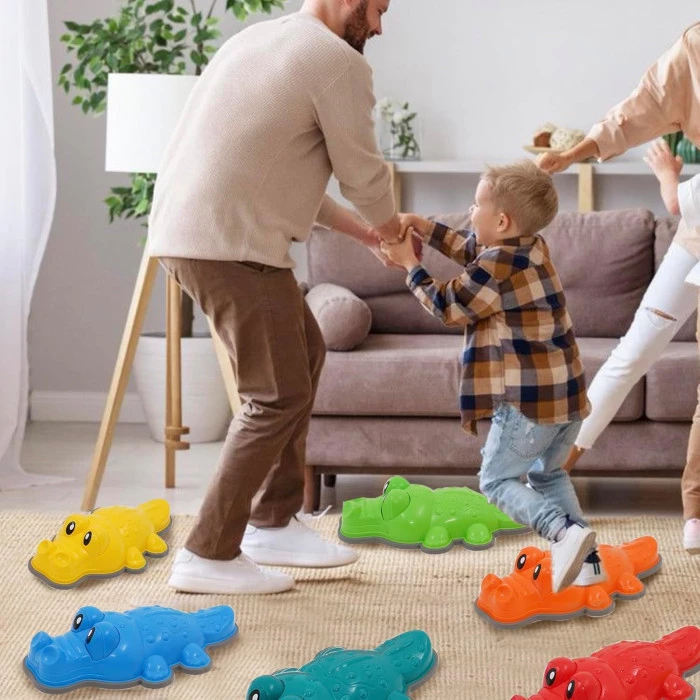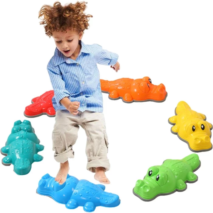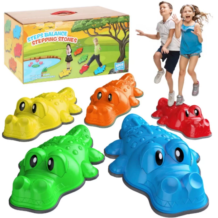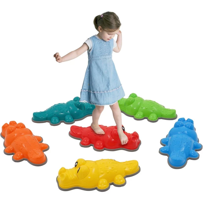 Набір яскравих та ергономічних балансирів підходить для занять у дитячому садочку, на спортивних майданчиках та призначається для розвитку координації рухів, моторних навичок та балансу у дітей. Комплект складається з шести різнокольорових фігурок у формі крокодилів. Кожен виріб має розміри 41 x 22 x 10 см. Кожен балансир має антиковзку гумку. Верхня частина має опуклості, що створюють масажний ефект для стоп.