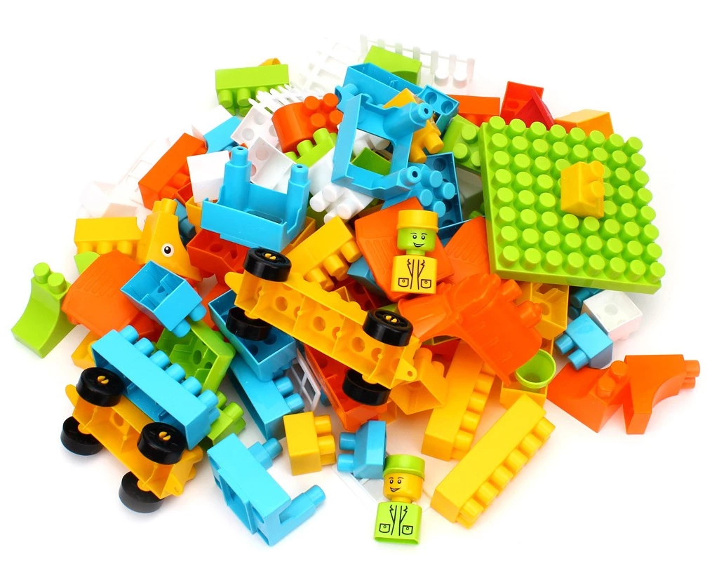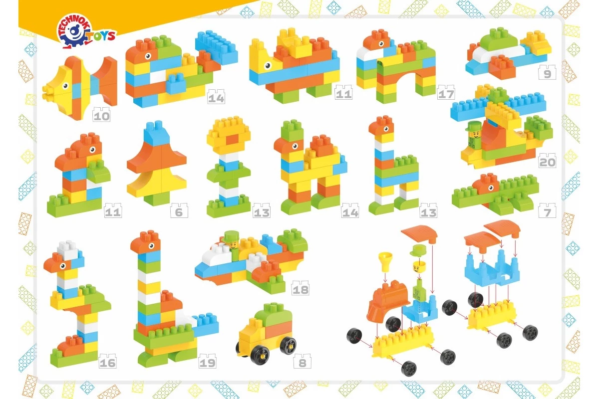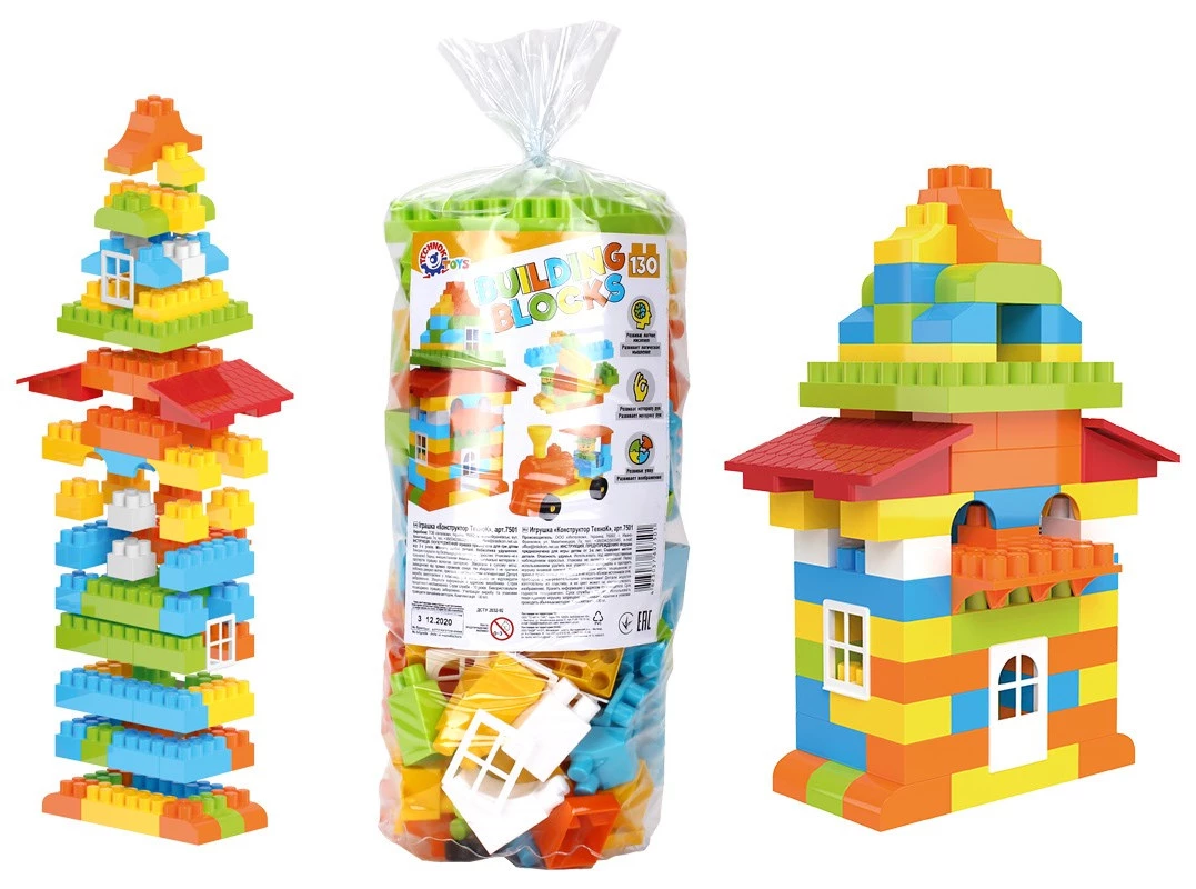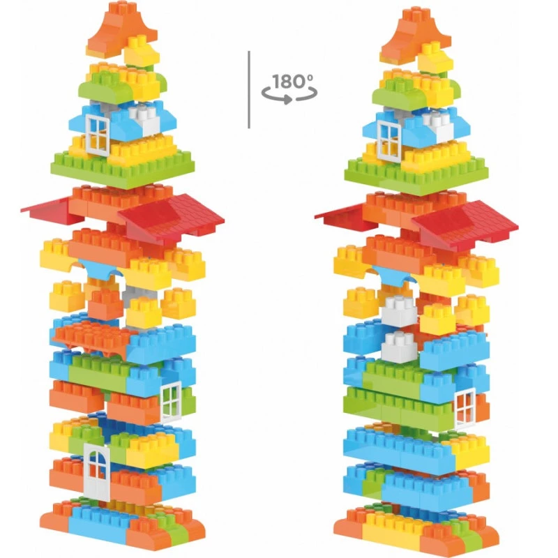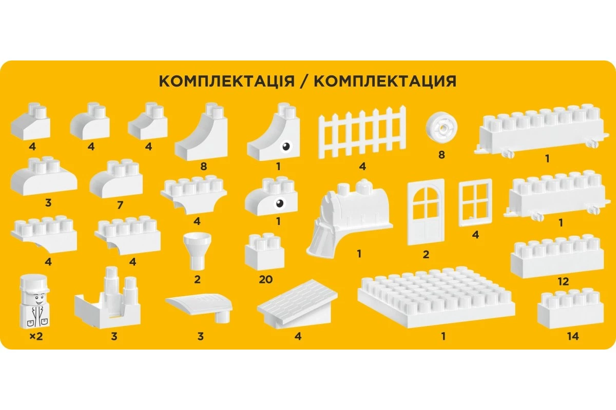 Конструктор складається зі 130 цікавих елементів. Маленькі будівельники знайдуть у комплекті цеглини зі зрізаними кутами та арками, для будівництва кораблів або створення фігурок тварин. Також в набір входять парканчики, віконця та двері для зведення замків. Основою для будиночків та інших архітектурних форм є велика пластина. Так, будиночок, побудований на платформі, буде міцним, його можна буде переносити та грати у будь-якому місці. А ще у наборі є платформи з колесами. З їхньою допомогою можна спорудити автомобіль, поїзд чи літак.