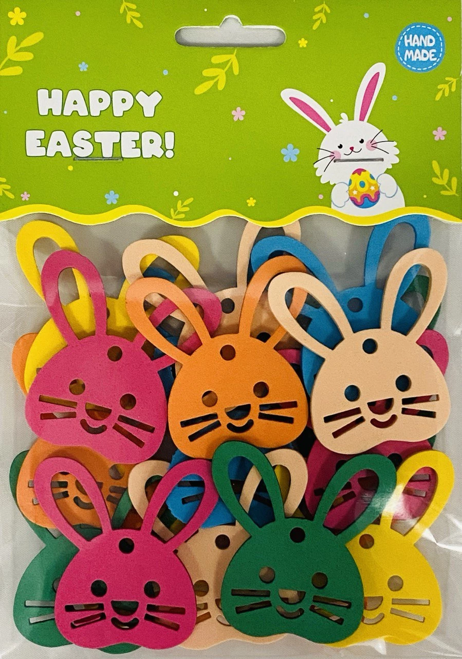 Яскравий набір декоративних елементів з фоамірану у формі симпатичних зайчиків ідеально підходить для весняної творчості. У комплект входить 18 фігурок різних соковитих кольорів. Кожен виріб має акуратну перфорацію (очі, вусики, посмішку) та спеціальний отвір для підвішування на стрічку або шнурок. М'який і бархатистий на дотик матеріал довговічний, не боїться вологи і добре тримає форму. Цей декор стане чудовим доповненням до великодніх кошиків, листівок ручної роботи або святкового оформлення інтер'єру. Створюйте затишок та святковий настрій з цим чудовим набором для hand made.
