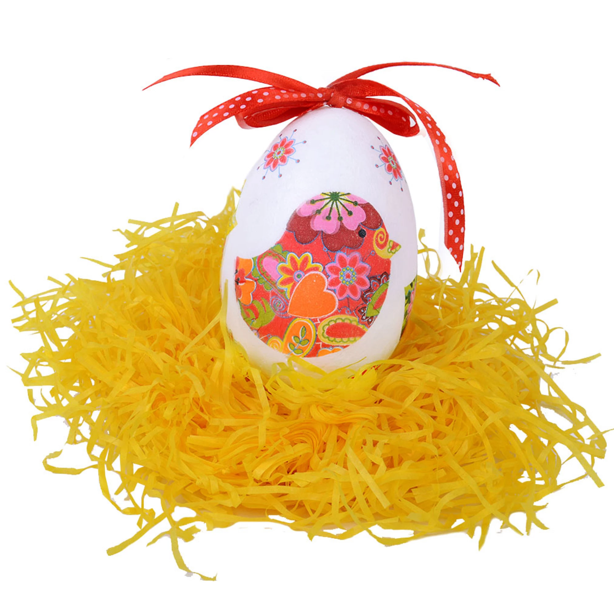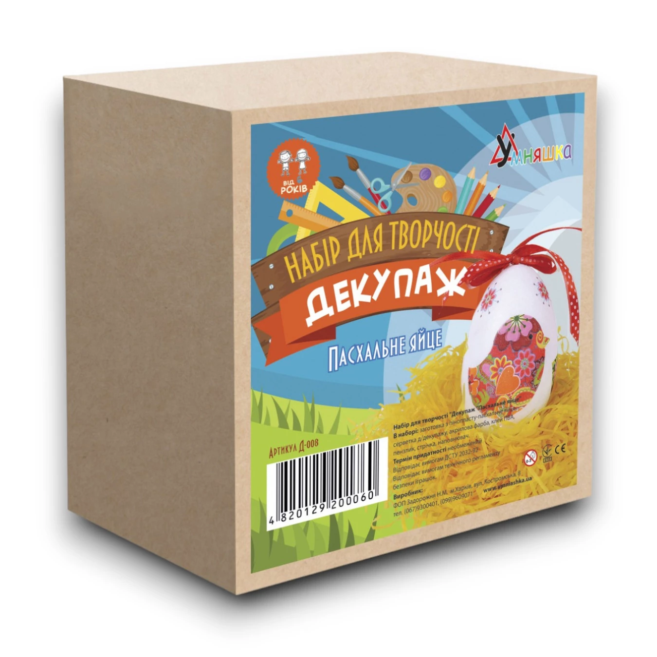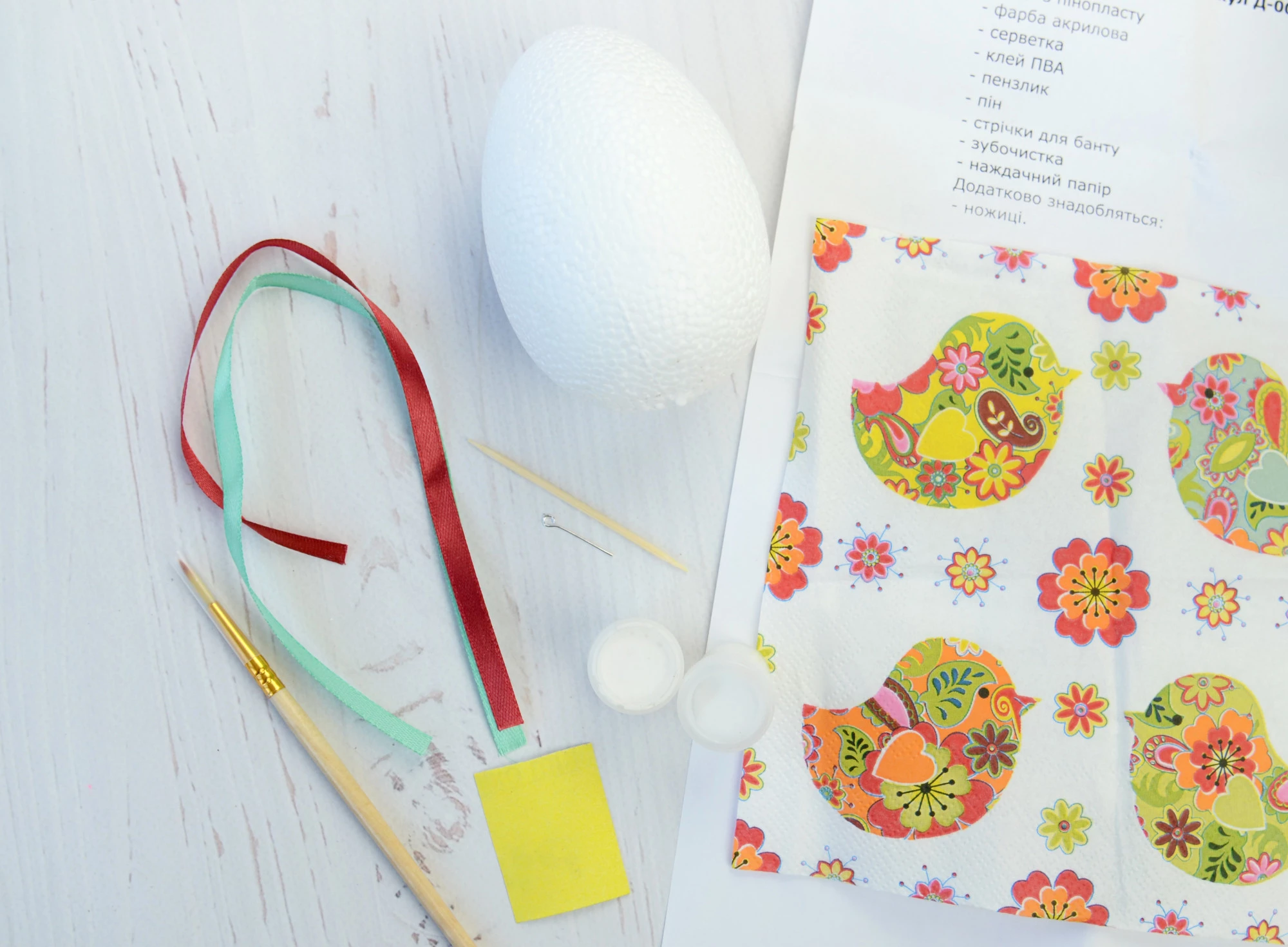 Створіть святкову писанку в техніці декупаж. У картонній упаковці знаходиться пінопластова заготовка у формі яйця та всі необхідні інструменти для роботи. Комплектація включає спеціальну серветку з яскравим квітковим орнаментом та зображеннями птахів. Для фіксації декоративних елементів передбачені баночки з клеєм ПВА та білою акриловою фарбою. Тонкий пензлик дозволяє акуратно наносити матеріали на поверхню заготвки, а наждачний папір служить для підготовки основи. У набір також входять різнокольорові стрічки та декоративний наповнювач для гарного оформлення готового виробу.