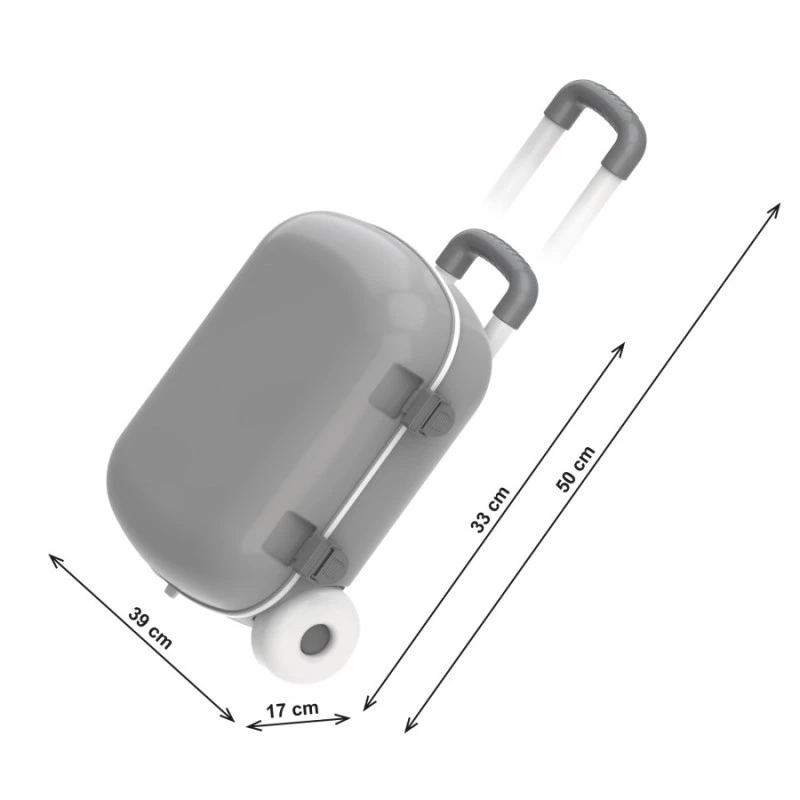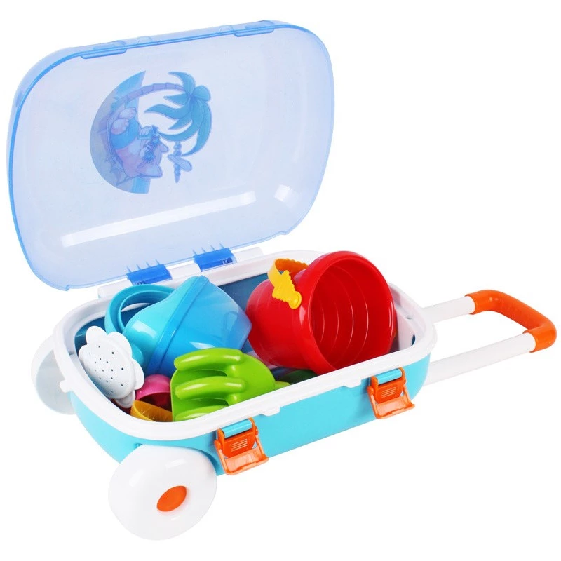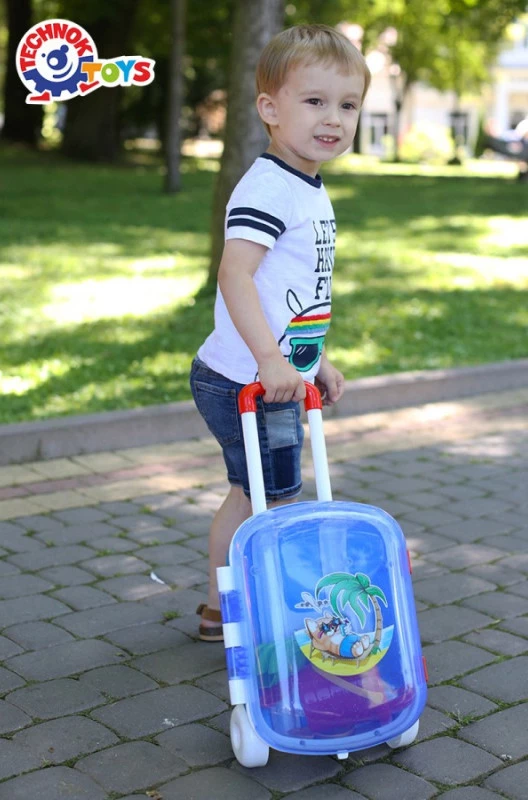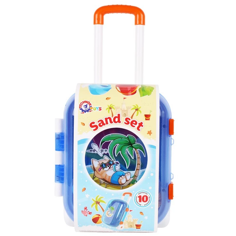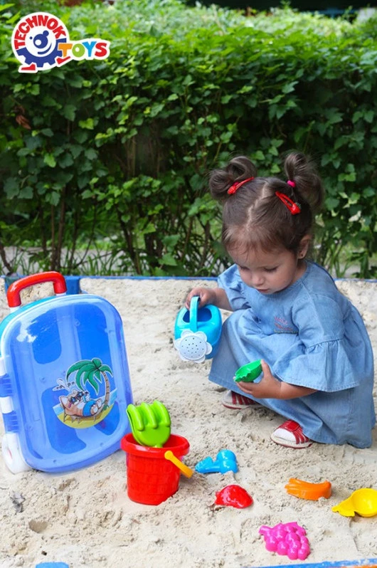 Набір для ігор у пісочниці в яскравій валізці включає відерце, лійку, лопатку, грабельки, а також 6 форм для піску у вигляді фруктів.Валіза виглядає, як «доросла». Вона виконана у яскравих кольорах, оснащена прозорою кришкою та прикрашена симпатичною наклейкою. Зображення нанесене за допомогою безпосередньої інжекції малюнка. Зображення не втратить яскравості і буде довговічним. Є зручна регульована ручка. Відкрита кришка фіксується в кількох положеннях, щоб дитині було легко складати і виймати речі з валізки. Надійні клямки дозволяють закрити кришку та зберігати ігрові аксесуари всередині. Міцні колеса дозволяють перевозити валізку.