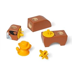 Будівельні блоки із цільного дерева, які легко захоплюються маленькими ручками, оснащені з'єднувачами, що дозволяють комбінувати деталі, створюючи звірят химерних форм та видів.