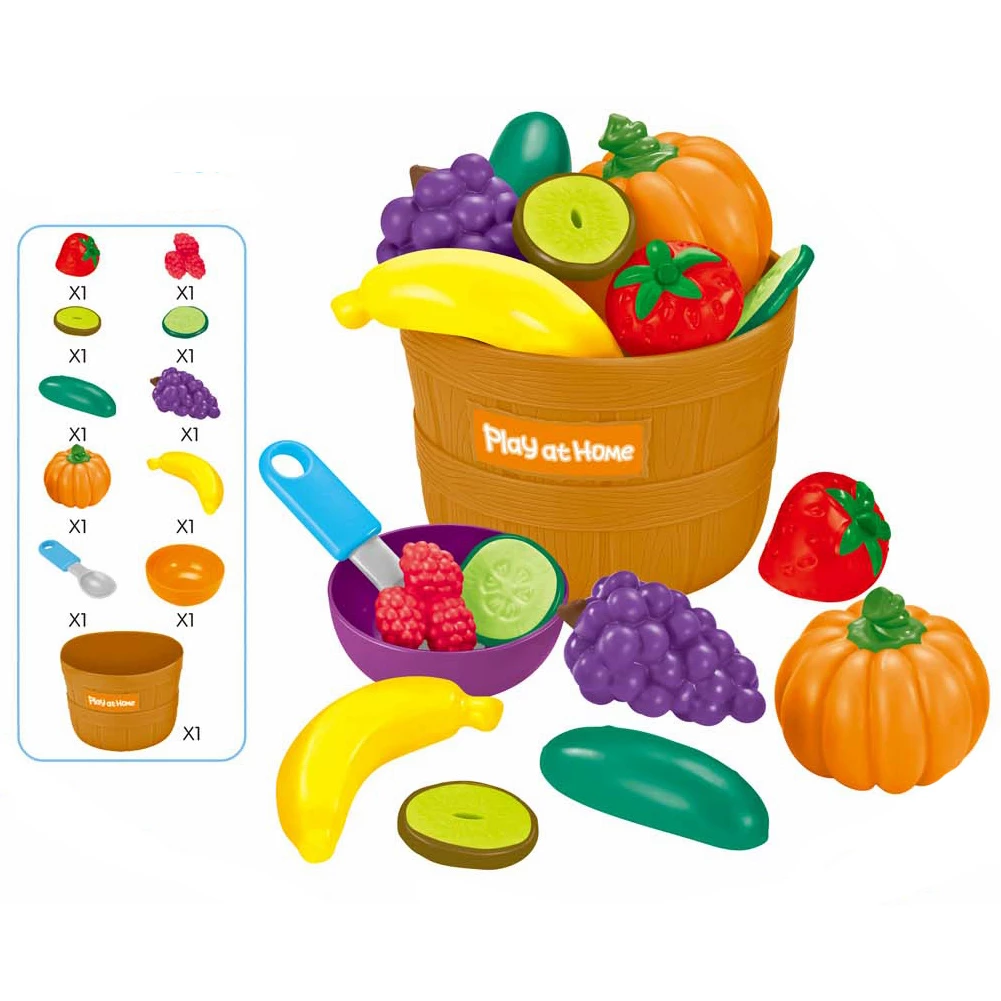 Цей набір – ідеальний вибір для дитячих сюжетно-рольових ігор у магазин, ресторан чи ферму. Він включає 11 предметів: фрукти та овочі, що реалістично виглядають, які зручно зберігати і переносити в спеціальному кошику.