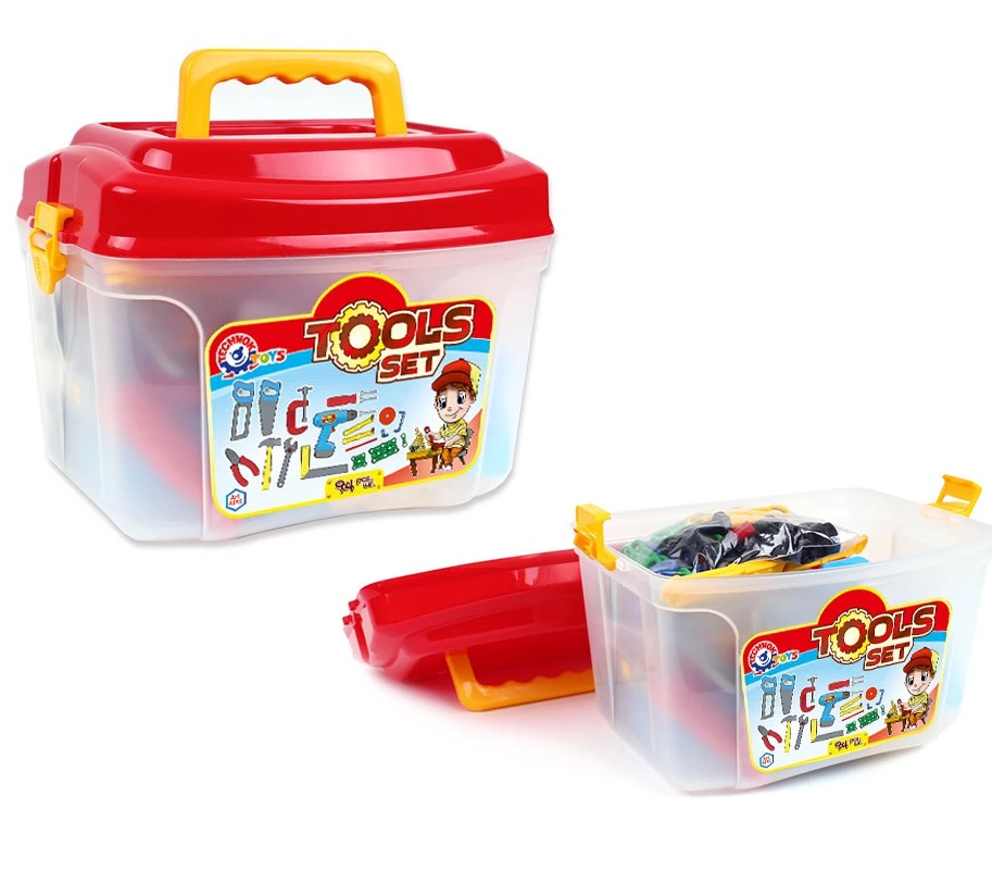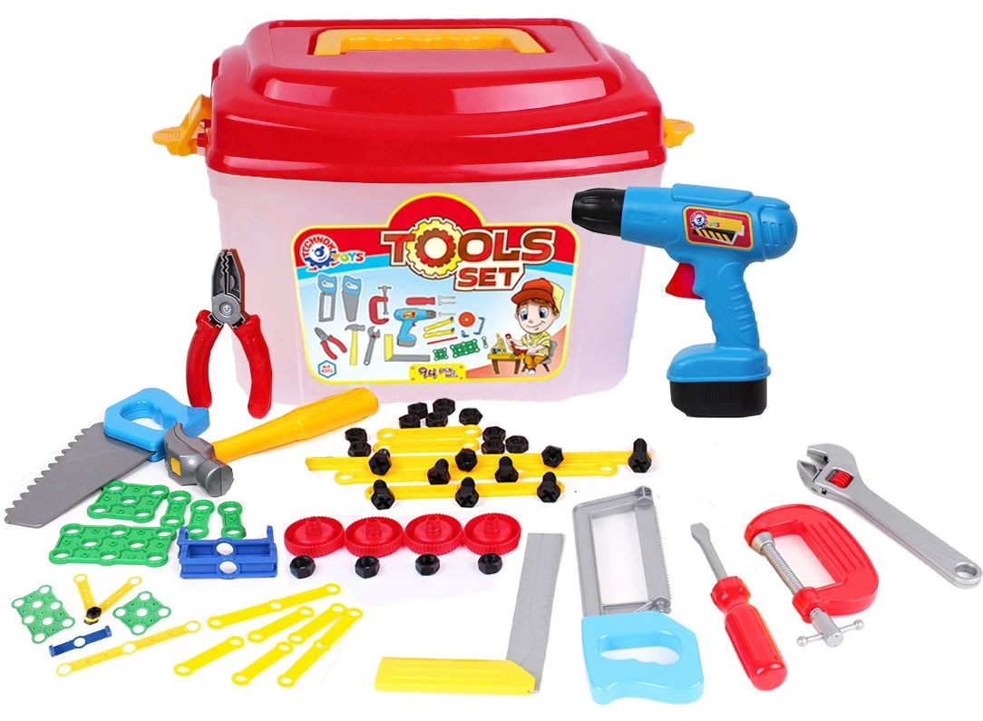 Цей набір іграшкових інструментів у зручному саквояжі – справжня знахідка для маленьких майстрів. Крім «традиційних» інструментів (молотка, пилки, викрутки, плоскогубців тощо), у представлений набір входять і різноманітні деталі: пластикові планки, косинці, гвинти та гайки. Це дозволить дитині познайомитися з принципами роботи різьбових з'єднань, що, безперечно, знадобиться у дорослому житті.