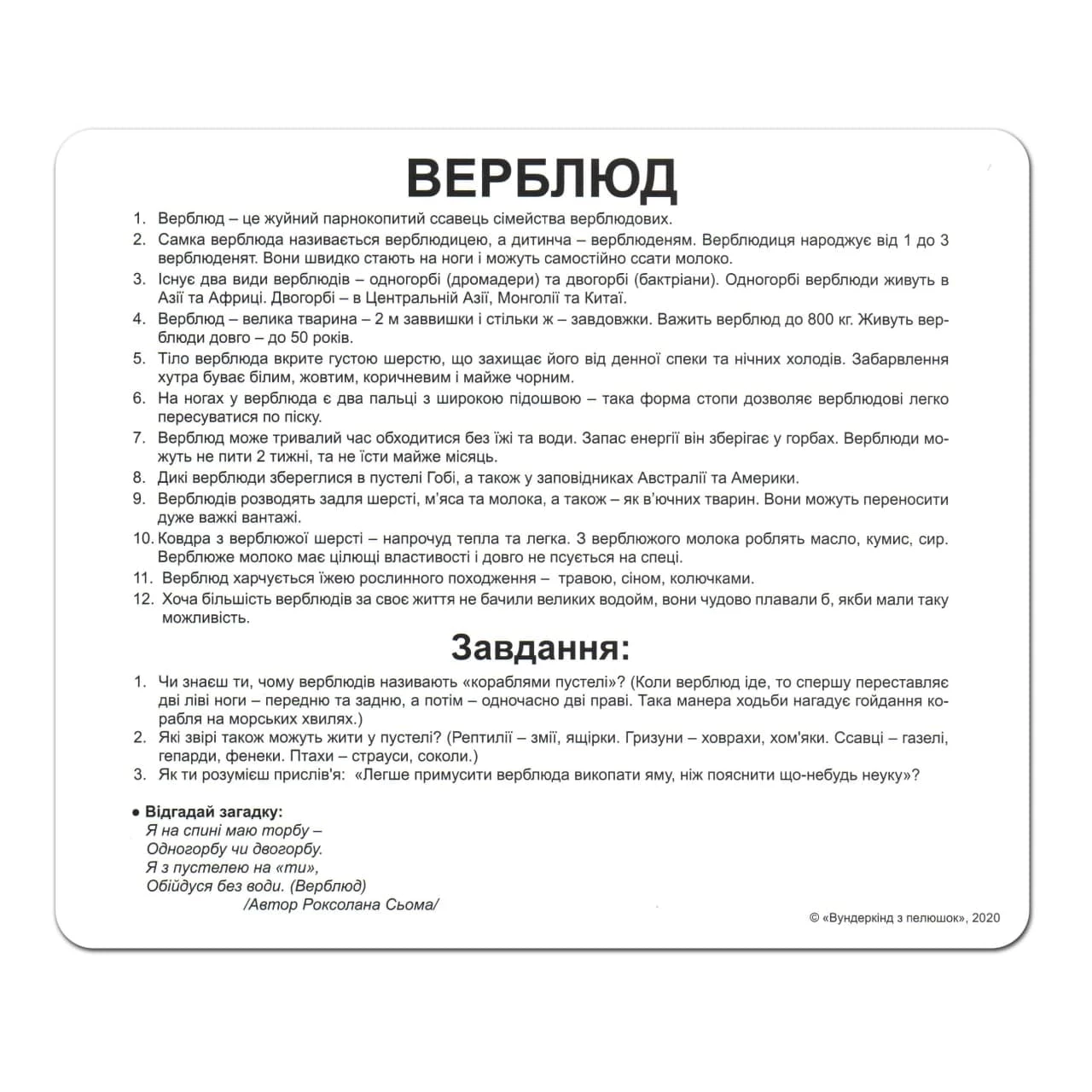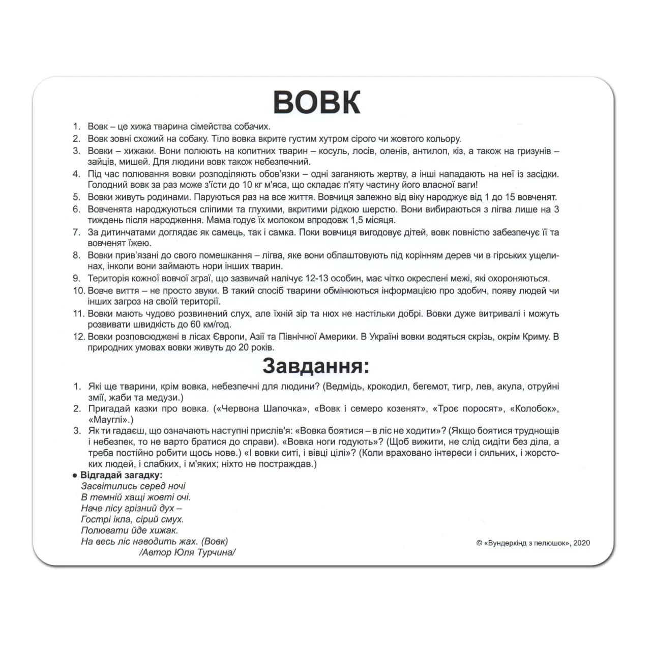 Нашу планету населяють найрізноманітніші тварини, і маленьким дослідникам буде корисно дізнатися про них якнайбільше. Факти про представників фауни розширюють кругозір, поповнюють словниковий запас та інтелектуальний багаж. Набір включає 20 карток. Кожна картка супроводжується яскравими ілюстраціями, цікавими фактами та завданнями (240 фактів та 80 завдань). У набір входять картки із зображеннями тварин, які мешкають у дикій природі.