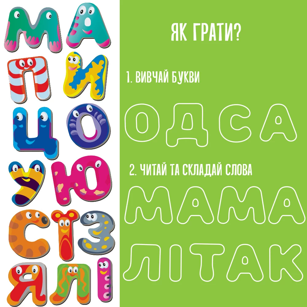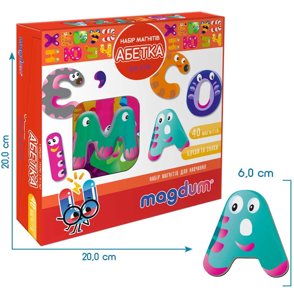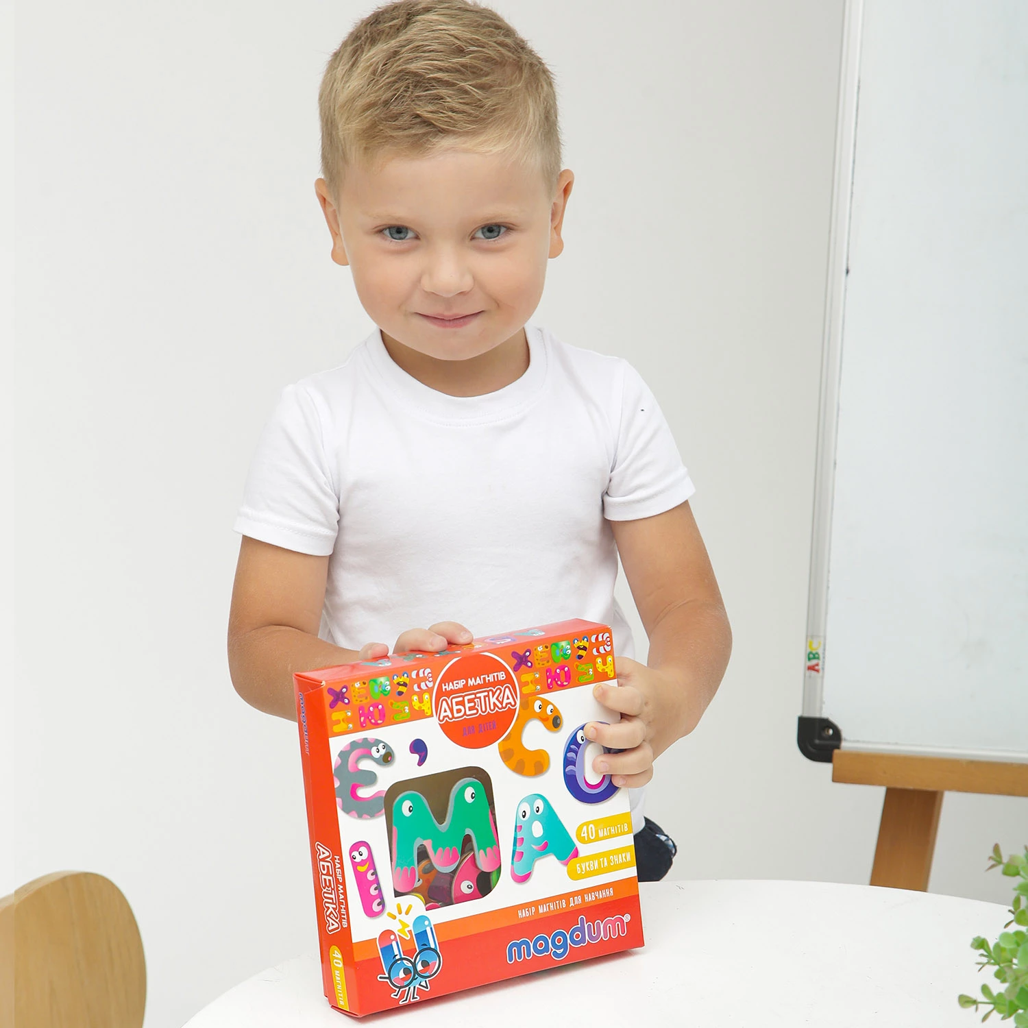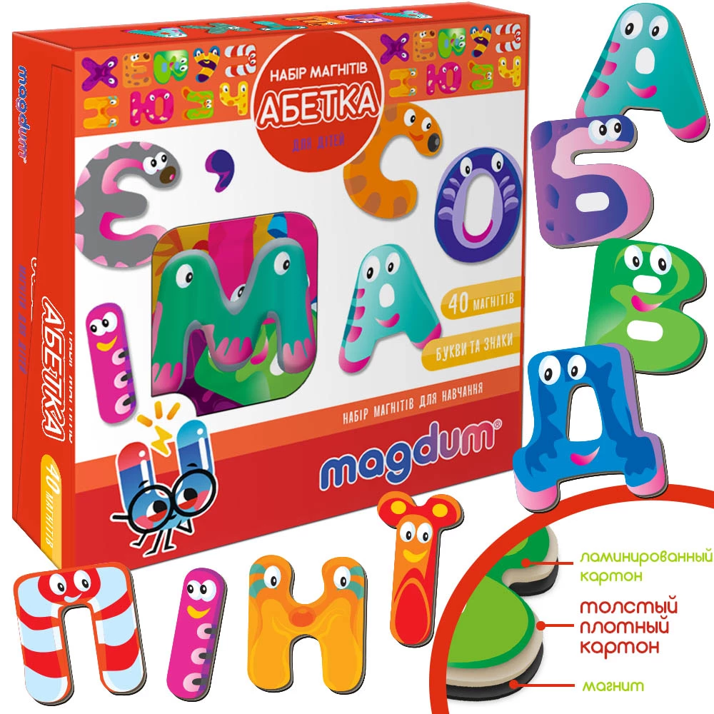 Нехай перше знайомство вашого малюка з літерами буде веселим та захопливим. Щоб дитина отримувала задоволення від навчання, подаруйте їй цей магнітний набір, який включає магнітні фігурки у вигляді літер українського алфавіту. Усього в комплекті міститься 40 великих магнітів-літер. Магніти зручні для маленьких дитячих ручок, мають закруглені кути та відрізняються міцністю та довговічністю.