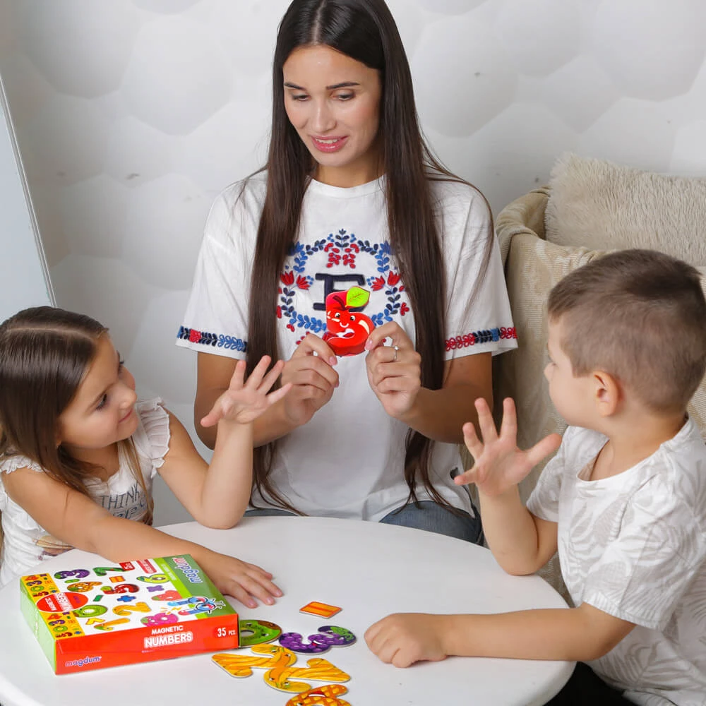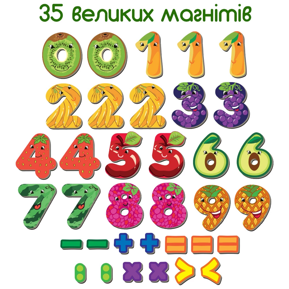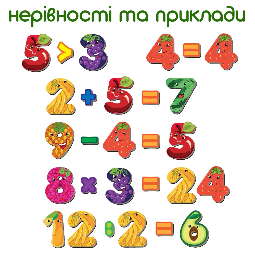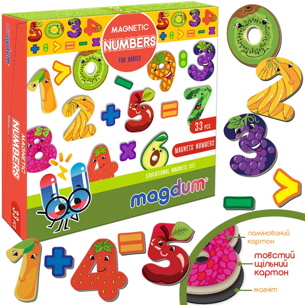 Використовуючи пропоновані магніти, дитина зможе не лише вивчити цифри, а й навчиться складати нерівності та приклади. Під час гри діти потренують дрібну моторику, уважність та пам'ять. Дизайн магнітів дозволяє впізнати в них якийсь фрукт або ягоду.
