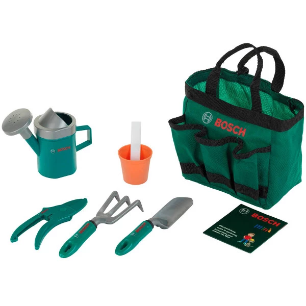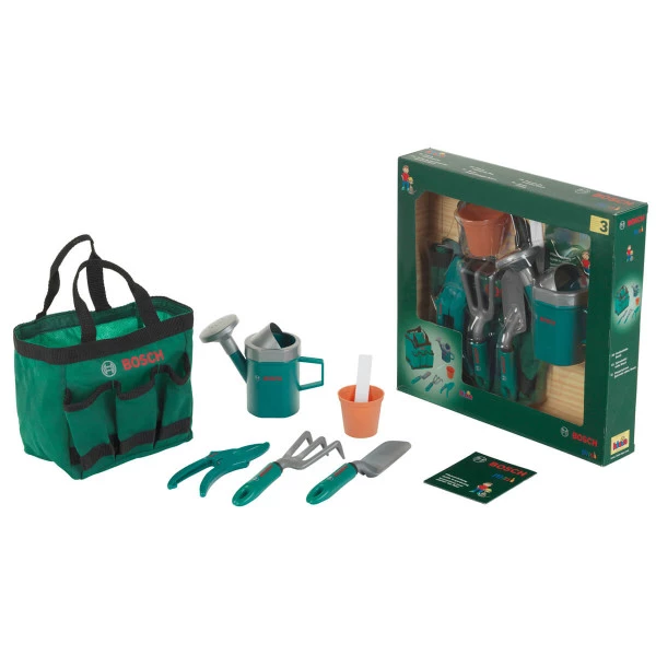 В комплект входять наступні інструменти: лопатка, граблі, секатор, лійка та горщик. Набір виконаний у стилі Bosch Garden, що зробить гру вашої дитини ще реалістичнішою та цікавішою. Сумка для зберігання інструментів сприяє організації та порядку.
