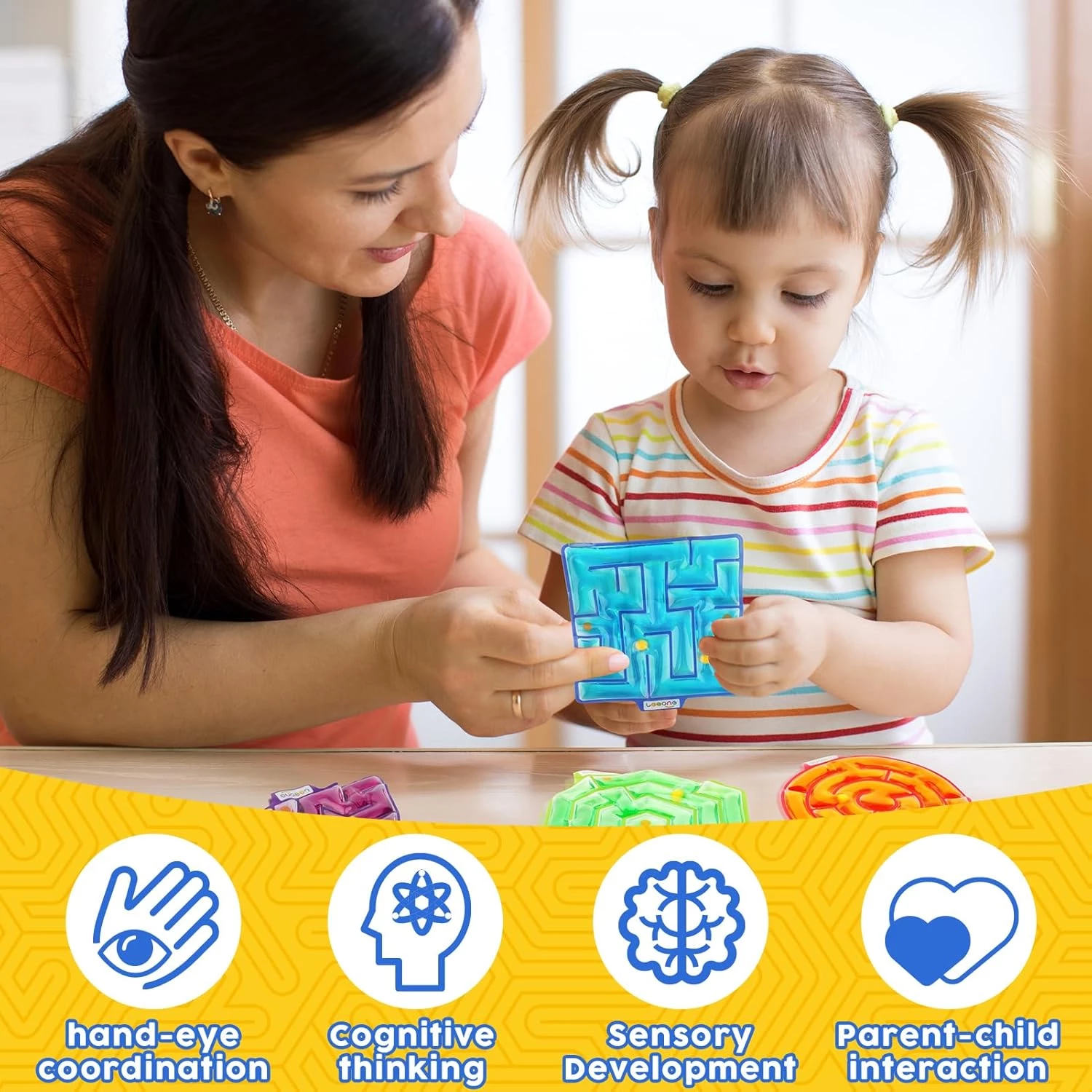 Яскраві сенсорні іграшки забезпечують візуальну стимуляцію, а також приємні тактильні відчуття у процесі гри. А стискання м'яких кульок і гелевого лабіринту допомагає вашій дитині весело та розслаблено проводити час, коли їй нудно.