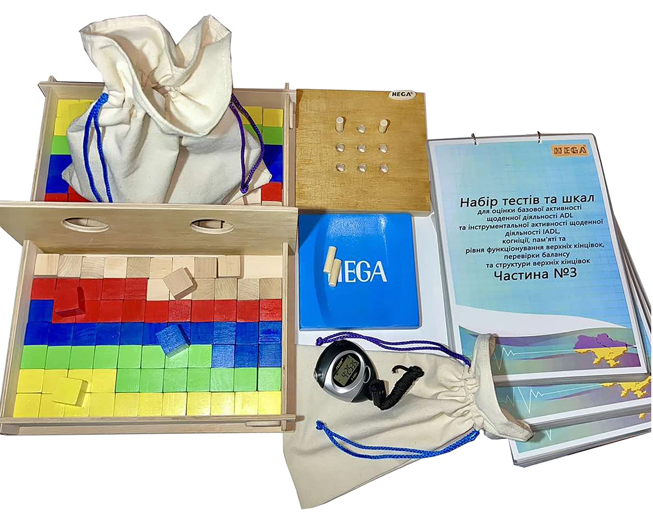 Комплектація модуля «Тест з кубиками». Цей інструмент призначений для оцінки базової мануальної спритності та координації рухів. У комплект входять: