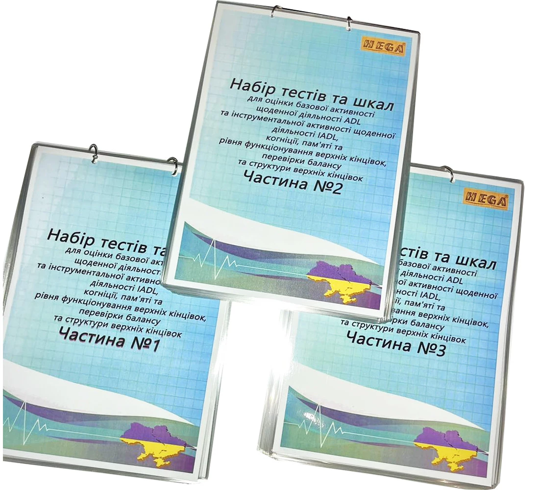 Методичний комплекс паперових шкал та опитувальників для оцінки функціонального стану. Комплексний інструмент для роботи мультидисциплінарної команди (ерготерапевти, фізичні терапевти, неврологи). Дозволяє проводити глибокий скринінг повсякденної життєдіяльності (ADL / IADL), когнітивного статусу та моторних функцій рук. Весь матеріал поділено на три тематичні частини для зручності навігації. Кожен лист має щільну ламінацію із захисним краєм, що запобігає розшаруванню та дозволяє обробляти матеріали антисептиком. Великий формат (не менше A4) з одностороннім друком забезпечує комфортне сприйняття тексту пацієнтом. Загальний обсяг матеріалів містить понад 137 робочих листів.